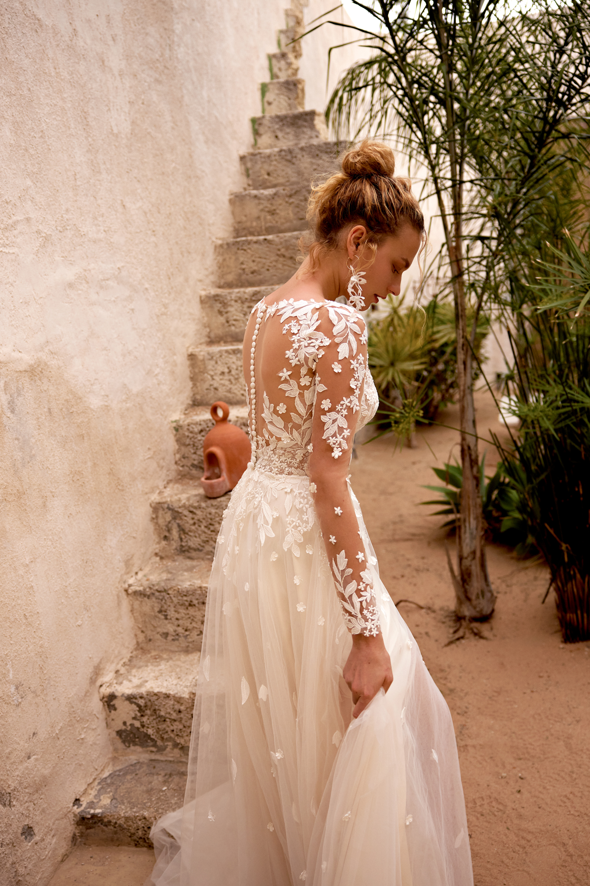 Die Schnitte sind bewusst entspannt: schmale Linien, transparente Ärmel, tiefe Rückenausschnitte, zarte Tüllröcke – perfekt für Bräute, die sich in ihrem Kleid frei bewegen und den Tag ganz sie selbst sein wollen. Die meisten Modelle verzichten auf starre Korsagen oder voluminöse Röcke. Stattdessen stehen leichte Stoffe und natürliche Eleganz im Vordergrund.