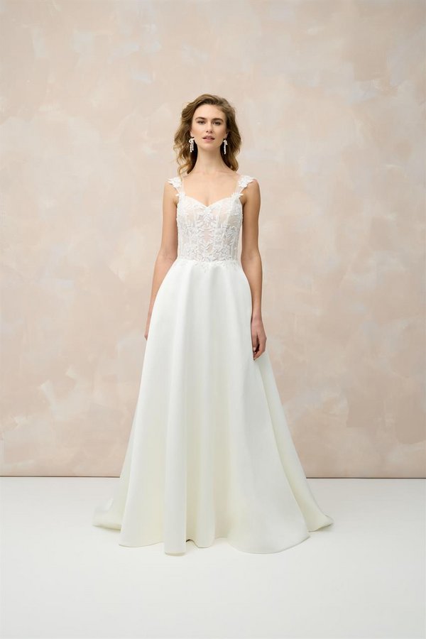 A-Linien Brautkleid mit Blütenspitze und Softtüll Dieses A-Linien Brautkleid vereint trendigen Corsagen-Look mit femininer Eleganz. Das semi-transparente Oberteil ist mit zarter Blüten- und Blätterspitze verziert, die mit feiner Bestickung für eine edle Struktur sorgt. Die klaren Linien der Korsage betonen deine Taille und geben dem Kleid einen modernen, aber dennoch romantischen Charakter. Der fließende Rock aus mehrlagigem Softtüll fällt leicht und sorgt für eine mühelose Silhouette, die sich bei jedem Schritt wunderschön bewegt. Der gerade, leicht geschwungene Ausschnitt bringt dein Dekolleté dezent zur Geltung, während feine Spaghettiträger für einen zarten Rahmen sorgen. Ein eleganter V-Ausschnitt im Rücken und eine zarte Knopfleiste setzen zusätzliche Akzente. Dieses Kleid ist ideal, wenn du eine Kombination aus Leichtigkeit, Modernität und Liebe zum Detail suchst. Finde dieses und viele weitere Traumkleider in unserem Store für Brautmode Köln und lass dich von unserer Kollektion inspirieren.