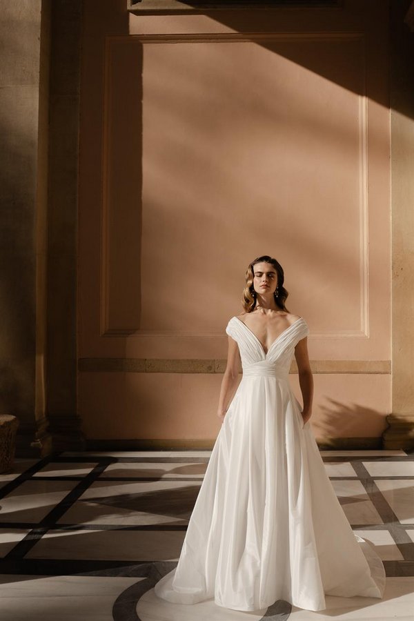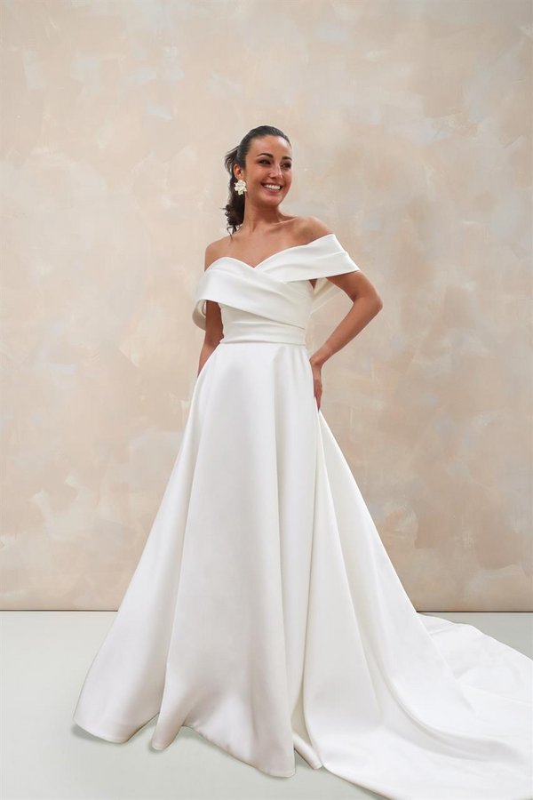 Cleanes A-Linien Brautkleid mit Carmen-Ausschnitt und Drapierungen