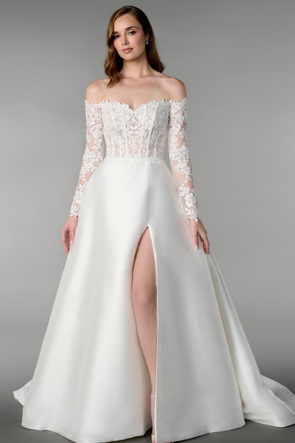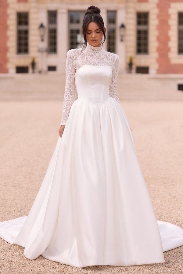 Royales Prinzessinnen-Brautkleid mit Mikado und Spitze perfekt vereint. Ein Brautkleid für einen wahrhaft royalen Auftritt: Dieses Prinzessinnen-Brautkleid verbindet klassische Eleganz mit modernem Chic. Die cleane Silhouette aus edlem Mikado-Stoff verleiht Dir einen luxuriösen Look, der bei jedem Schritt beeindruckt. Highlight sind die langen, fein gearbeiteten Spitzen-Ärmel, die Dir einen Hauch von Romantik und zugleich königliche Ausstrahlung schenken. Das Mieder des  Prinzessinnen-Brautkleides sitzt perfekt und wird durch die figurformende Basken-Taille betont – so zaubert es eine feminine Silhouette, die Dich an Deinem großen Tag strahlen lässt. Der voluminöse Rock fällt in edlen Falten und endet in einer eleganten Schleppe, die für einen echten Wow-Moment beim Einzug sorgt. Dieses Hochzeitskleid vereint zeitlose Eleganz mit einem modernen Twist und ist ideal für Bräute, die einen glamourösen, aber zugleich klaren Look lieben. Probiere dieses Highlight  von Cinderella Brautmode Köln bei uns an und lass Dich von seiner außergewöhnlichen Wirkung verzaubern. Dein Prinzessinnen-Moment wartet schon auf Dich!