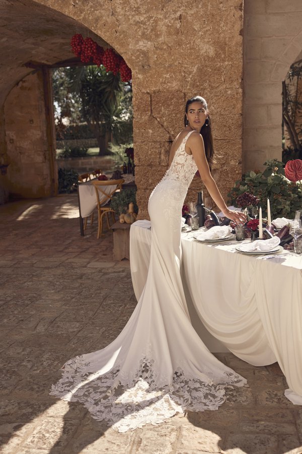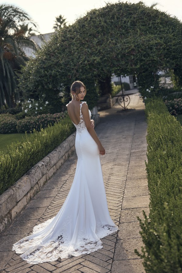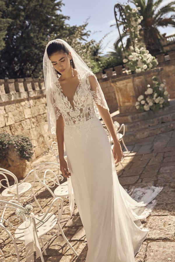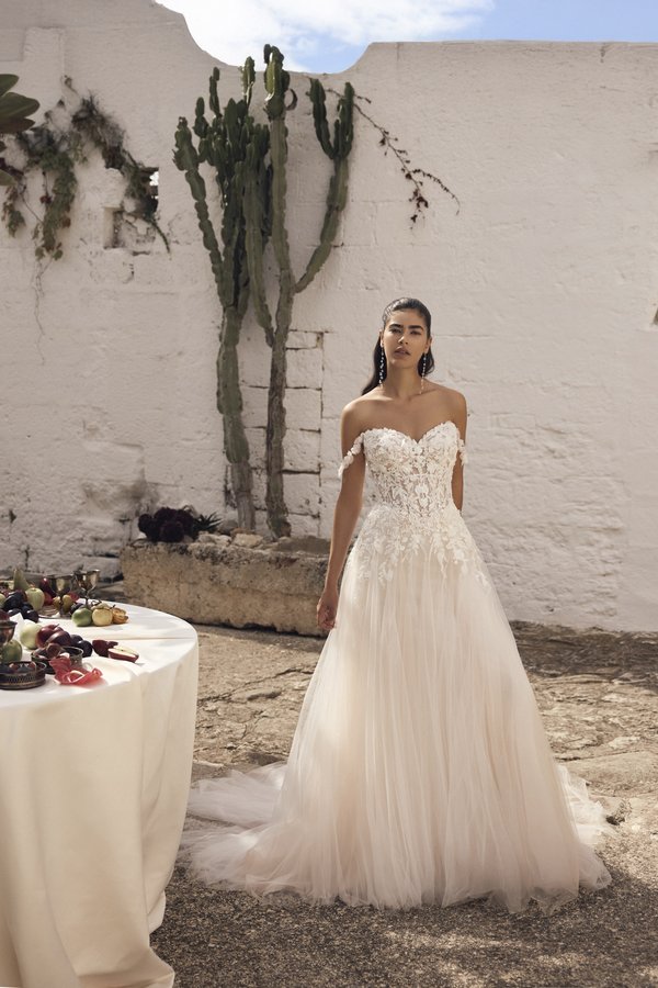 Dieses romantische A-Linien Brautkleid aus Tüll verzaubert mit einer traumhaft leichten Ausstrahlung und liebevollen Details. Die fließende Silhouette umspielt sanft die Figur und sorgt für einen wunderschönen, femininen Look. Das Oberteil begeistert mit einer herzförmigen Corsage, die das Dekolleté stilvoll betont. Die zarten Carmenträger sind mit floralen Applikationen verziert und verleihen dem Brautkleid eine besonders romantische Note. Die taillierte Passform schmeichelt der Figur und geht fließend in einen weich fallenden Tüllrock über. Feine Spitze, dreidimensionale Blütenapplikationen und zarte Perlendetails machen das Brautkleid zu etwas ganz Besonderem. Auch von hinten wirkt das Brautkleid wunderschön leicht und elegant. Die sanfte Schleppe rundet den Look harmonisch ab und sorgt für einen traumhaften Auftritt. Dieses Brautkleid begeistert mit romantischer Leichtigkeit, floralen Details und einer märchenhaften Ausstrahlung.