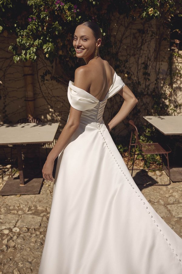 A-Linien Brautkleid im Clean Chic Stil mit Carmen-Ausschnitt