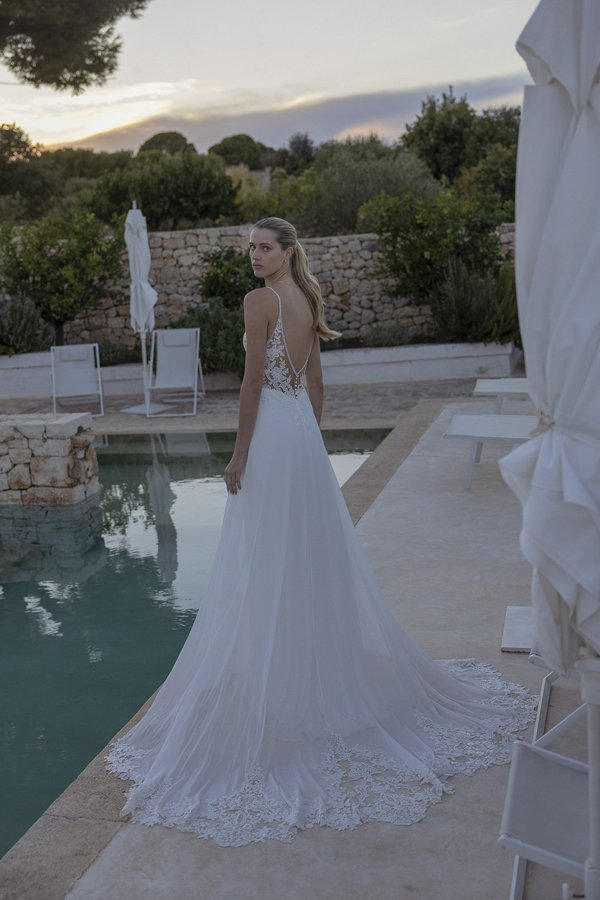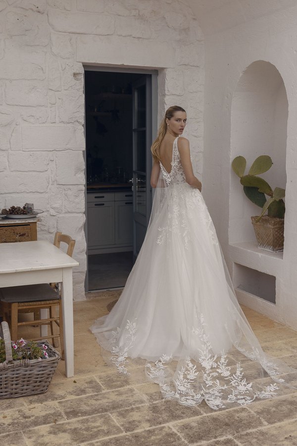 Dieses elegante Brautkleid verbindet zeitlose Eleganz mit einem modernen Touch und ist die perfekte Wahl für die Braut, die an ihrem großen Tag sowohl stilvoll als auch raffiniert erscheinen möchte. Das Kleid verfügt über ein zartes Oberteil mit einem transparenten, tief ausgeschnittenen Rücken, der von filigranen Trägern gehalten wird. Die Spitze auf dem Oberteil erstreckt sich in floralen Mustern und verleiht dem Design eine romantische Note, während die leichte Transparenz des Materials einen subtilen, verführerischen Effekt erzeugt. Der Rock fällt in weichen Tülllagen zu Boden und wird von einer beeindruckenden Schleppe gekrönt, die mit floralen Spitzenapplikationen verziert ist. Diese Applikationen sind sorgfältig platziert und fügen sich harmonisch in das Design des Kleides ein, sodass die Schleppe wie ein natürliches Fortführen der floralen Spitze auf dem Oberteil wirkt. Die Schleppe ist nicht nur ein optisches Highlight, sondern sorgt auch dafür, dass die Braut bei jedem Schritt einen majestätischen Eindruck hinterlässt. Dieses Kleid ist ideal für Bräute, die eine perfekte Balance zwischen traditioneller Romantik und moderner Eleganz suchen. Es kombiniert einen verführerischen Rückenausschnitt mit einer luxuriösen Schleppe, was es zu einem echten Blickfang auf jeder Hochzeit macht. Die floralen Details und die fließende Silhouette machen dieses Kleid zu einer Traumwahl für eine unvergessliche Hochzeit.