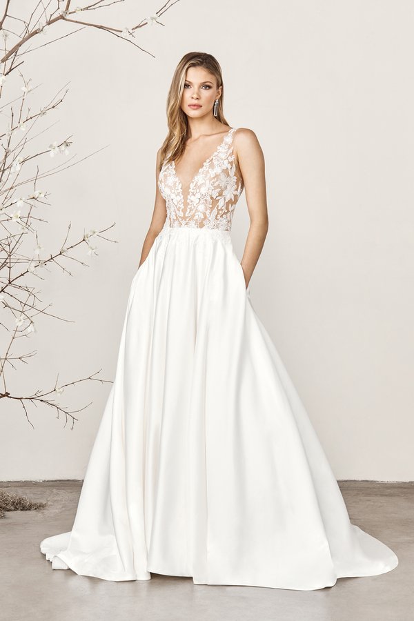 Dieses elegante A-Linien-Brautkleid aus luxuriösem Mikado vereint klassischen Stil mit modernen Akzenten. Mikado ist bekannt für seine geschmeidige, leicht strukturierte Oberfläche, die weniger glänzend als Satin ist und dem Kleid eine zeitlose Raffinesse verleiht. Der Stoff fällt makellos und sorgt für eine klare, edle Silhouette, die Deine Figur wunderschön betont. Das Kleid zeichnet sich durch einen tiefen Ausschnitt aus, der durch zarte Spitzenverzierungen stilvoll eingerahmt wird. Diese feinen Spitzendetails verleihen dem Design eine romantische und feminine Note, die perfekt zum klassischen Stil des Kleides passt. Die A-Linien-Silhouette ist besonders schmeichelhaft und akzentuiert die Taille, was für eine anmutige und elegante Form sorgt. Ein besonderes Highlight dieses Brautkleides sind die praktischen, aber dennoch stilvollen Taschen, die dem Kleid eine moderne Note verleihen. Sie fügen sich dezent in das Design ein und bieten gleichzeitig einen Hauch von Lässigkeit, ohne die Eleganz zu beeinträchtigen. Dieses Kleid ist ideal für Bräute, die sich eine Mischung aus traditioneller Eleganz und modernen Details wünschen. Der Mikado-Stoff verleiht dem Kleid eine luxuriöse Struktur, während die zarten Spitzeneinfassungen und der tiefe Ausschnitt für einen Hauch von Romantik sorgen. Egal ob bei einer großen, formellen Feier oder einer intimeren Zeremonie – dieses Kleid passt zu jeder Art von Hochzeit und lässt Dich stilvoll und selbstbewusst auftreten.