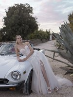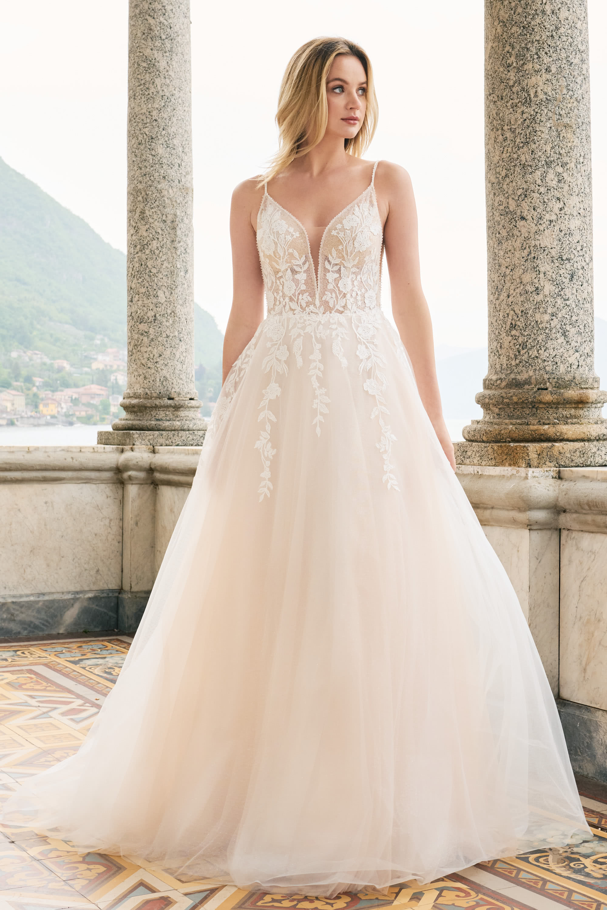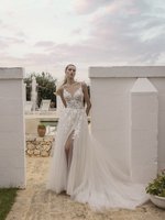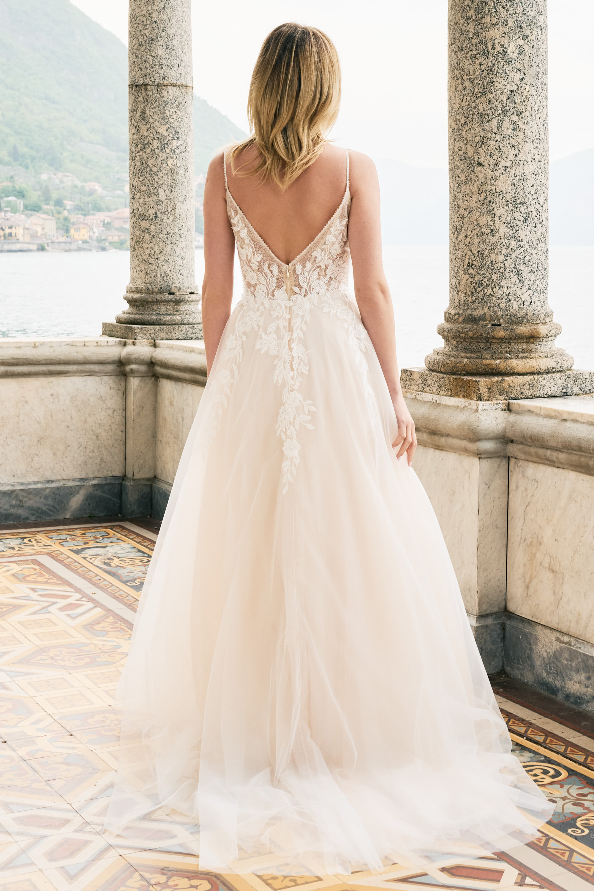 Der strukturierte Tüll, der sanft durch das Oberteil schimmert, schenkt diesem Kleid eine unvergleichliche Tiefe und einen Hauch von Magie. Die Spitzenapplikationen setzen ihren märchenhaften Tanz fort und vereinen sich liebevoll mit dem weichen Tüllrock. Jeder Stich und jede Linie spiegeln die Liebe zum Detail wider, und in diesem einzigartigen Kleid kannst du dich darauf freuen, dein Herz in einem Traum aus Stoff und Spitze tanzen zu sehen.