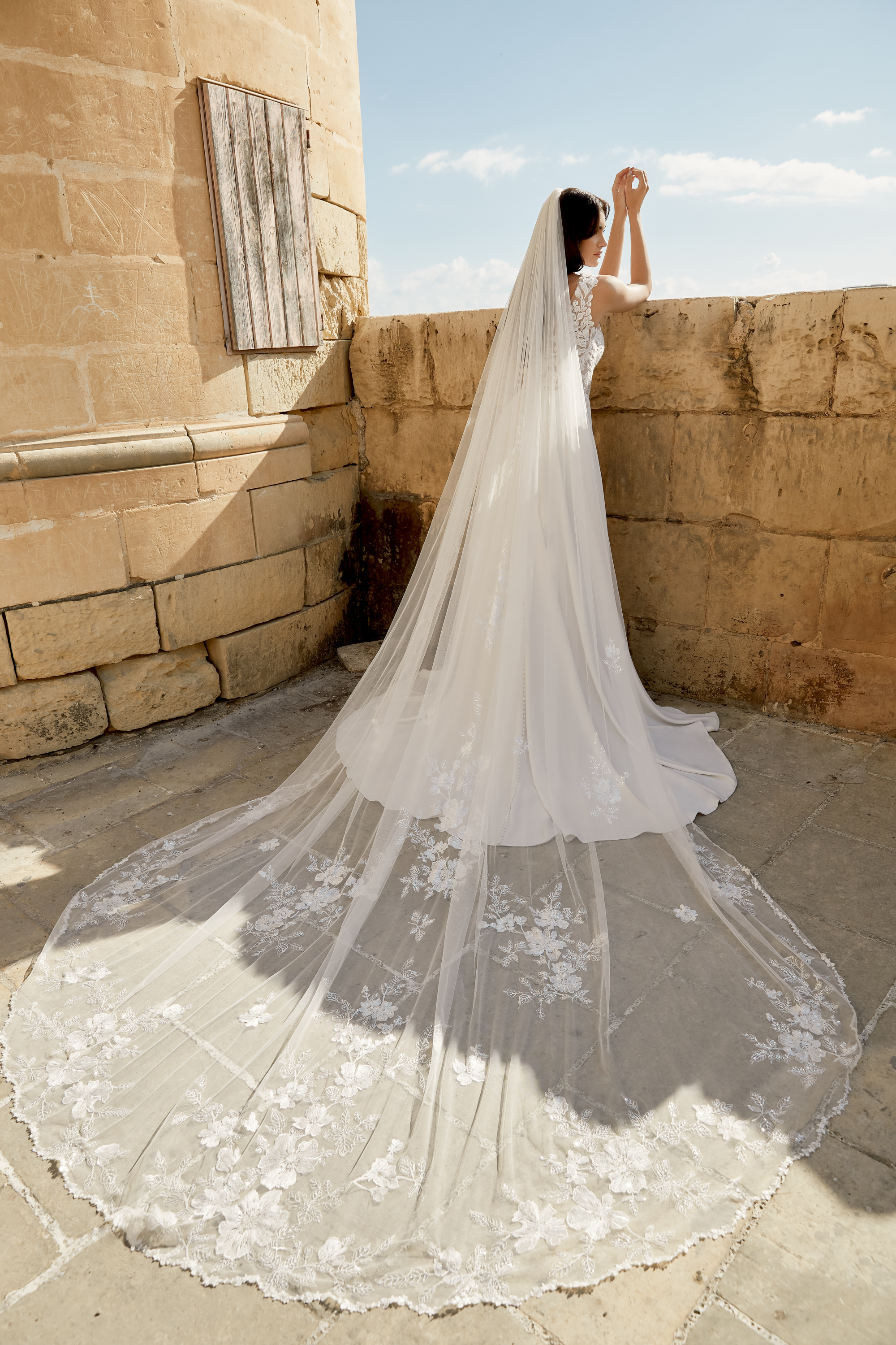 Dieses moderne A-Linien-Brautkleid aus luxuriösem Crêpe verbindet elegante Schlichtheit mit einem Hauch von Boho-Romantik. Das Kleid besticht durch seinen raffinierten Sabrina-Illusionsausschnitt, der auf kunstvolle Weise mit zarten Spitzenapplikationen verziert ist. Diese filigranen Details sorgen für eine romantische und dennoch zeitgemäße Ausstrahlung, die perfekt für die moderne Braut ist.