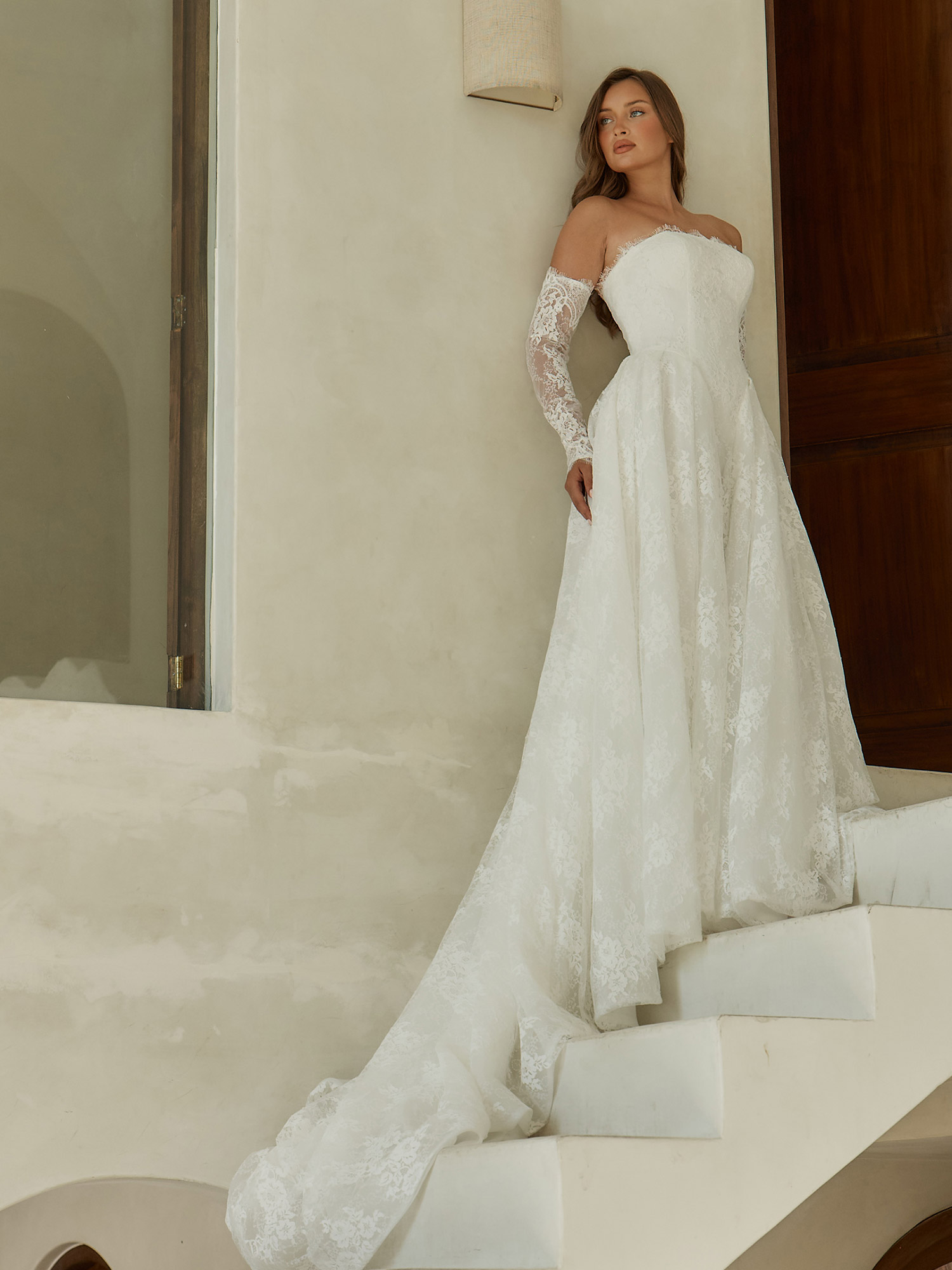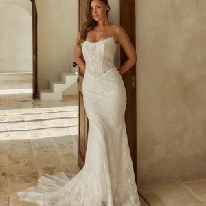 Die trägerslose Corsage aus fein gearbeiteter floraler Spitze ist blickdicht unterlegt und bietet sicheren Halt. Die detailreiche Spitzenstruktur verleiht dem Oberteil Tiefe und Eleganz, während der weich geformte Ausschnitt das Dekolleté auf natürliche Weise betont. Die Linienführung wirkt ruhig und klar und unterstreicht die zeitlose Ausstrahlung dieses Brautkleides.