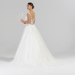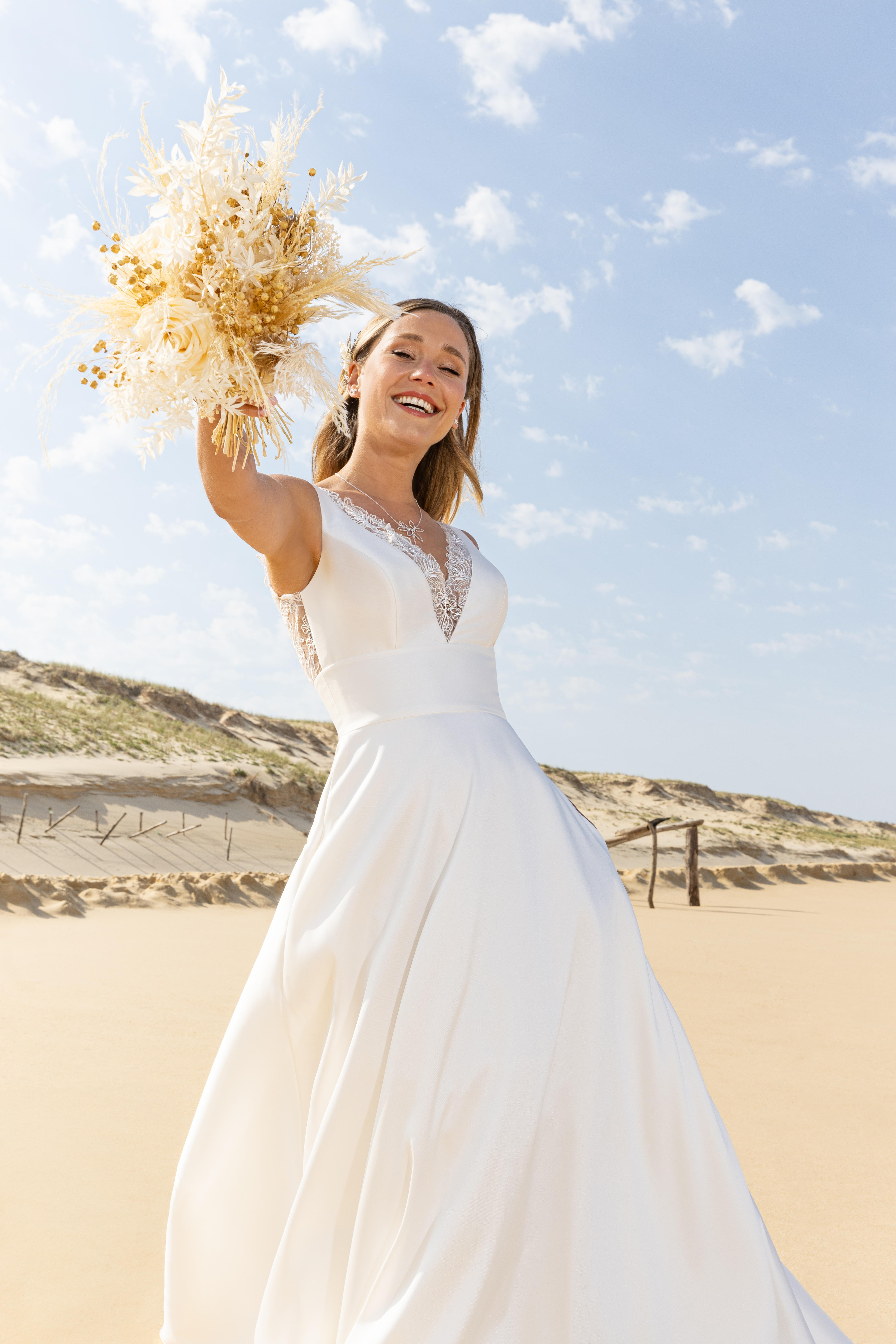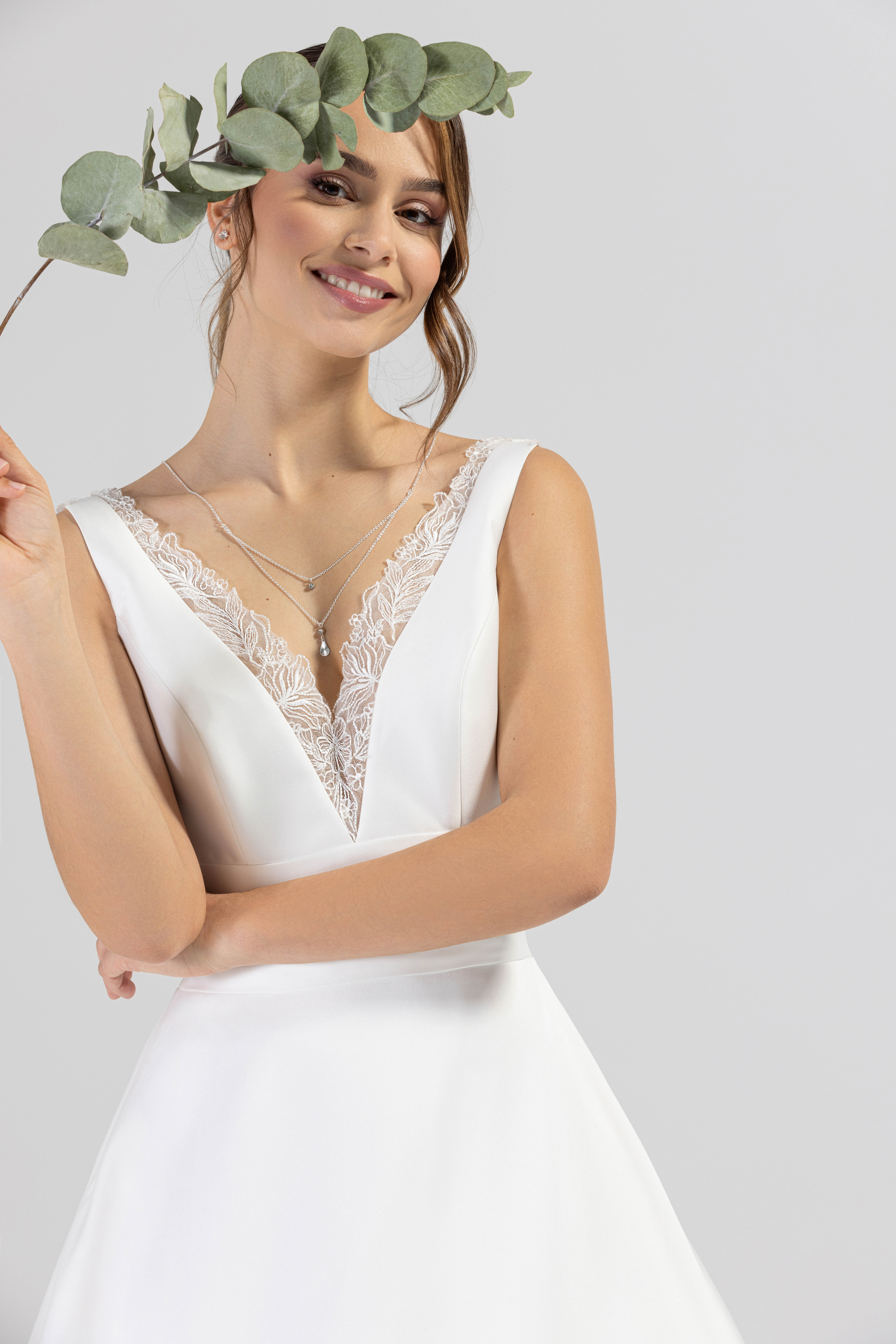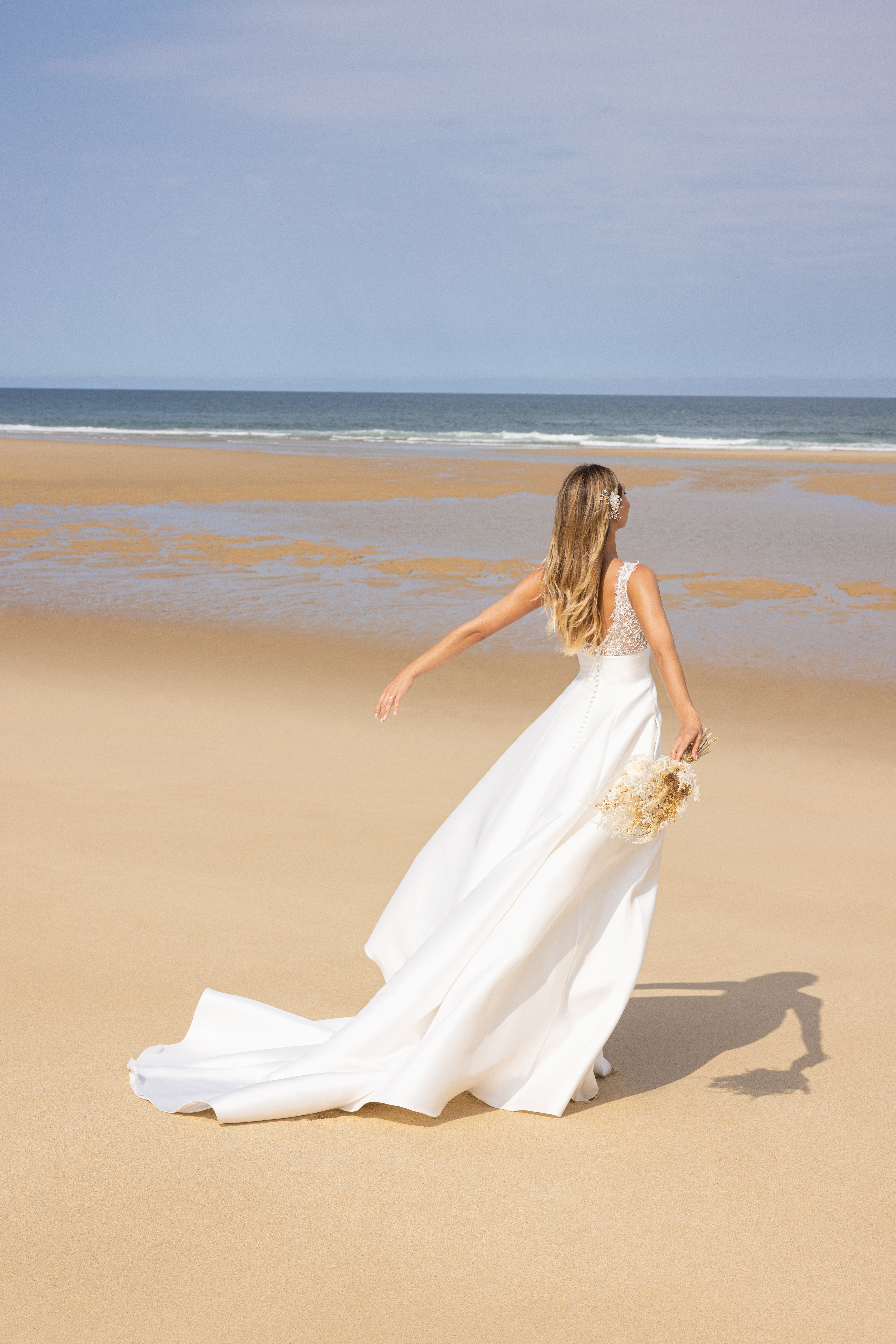 Dieses Kleid ist ideal für Bräute, die sich eine Mischung aus traditioneller Eleganz und modernen Details wünschen. Der Mikado-Stoff verleiht dem Kleid eine luxuriöse Struktur, während die zarten Spitzeneinfassungen und der tiefe Ausschnitt für einen Hauch von Romantik sorgen. Egal ob bei einer großen, formellen Feier oder einer intimeren Zeremonie – dieses Kleid passt zu jeder Art von Hochzeit und lässt Dich stilvoll und selbstbewusst auftreten.