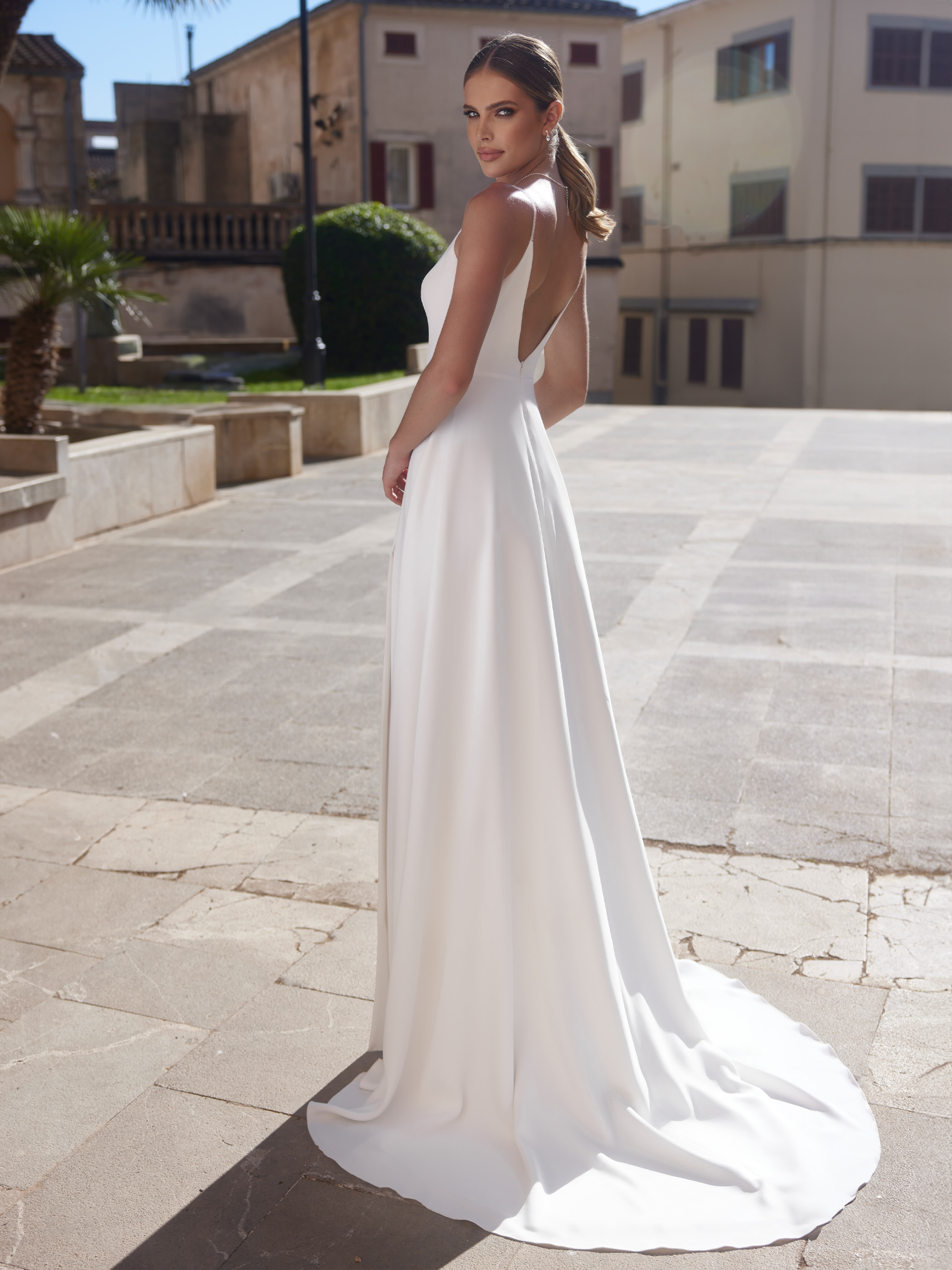 Dieses Kleid ist ideal für Bräute, die sich einen zeitlosen, aber dennoch modernen Look wünschen. Die Kombination aus klaren Linien, luxuriösem Stoff und zarten Details wie den Perlen und dem Schlitz macht dieses Kleid zu einer hervorragenden Wahl für elegante Zeremonien, Stadt-Hochzeiten oder intime Feierlichkeiten.