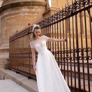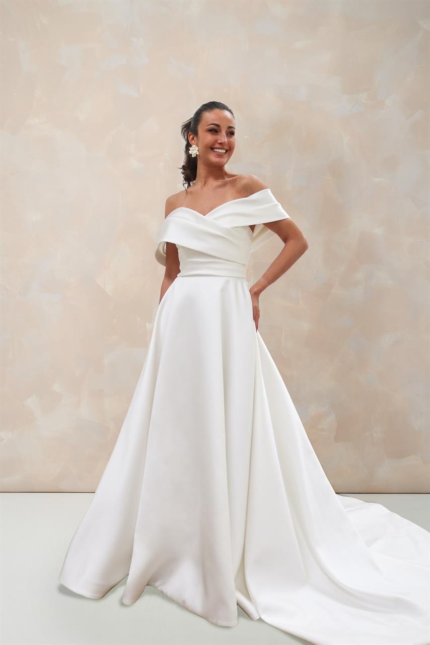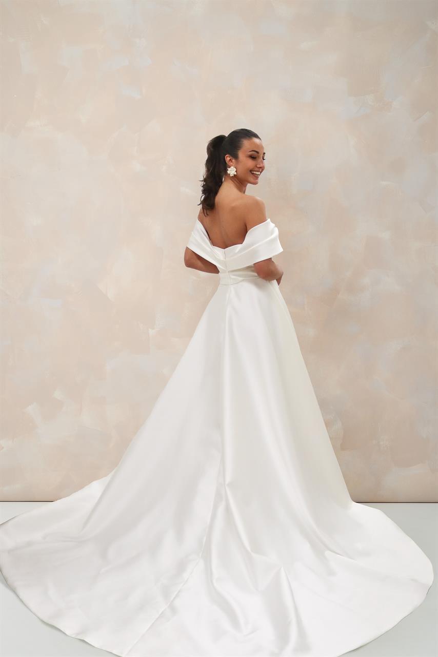 Klassisch, elegant und doch absolut modern – dieses A-Linien Brautkleid ist die perfekte Wahl für Bräute, die einen klaren, stilvollen Look lieben. Der hochwertige Mikado-Stoff verleiht dem Brautkleid seine luxuriöse Struktur und einen dezenten Glanz.