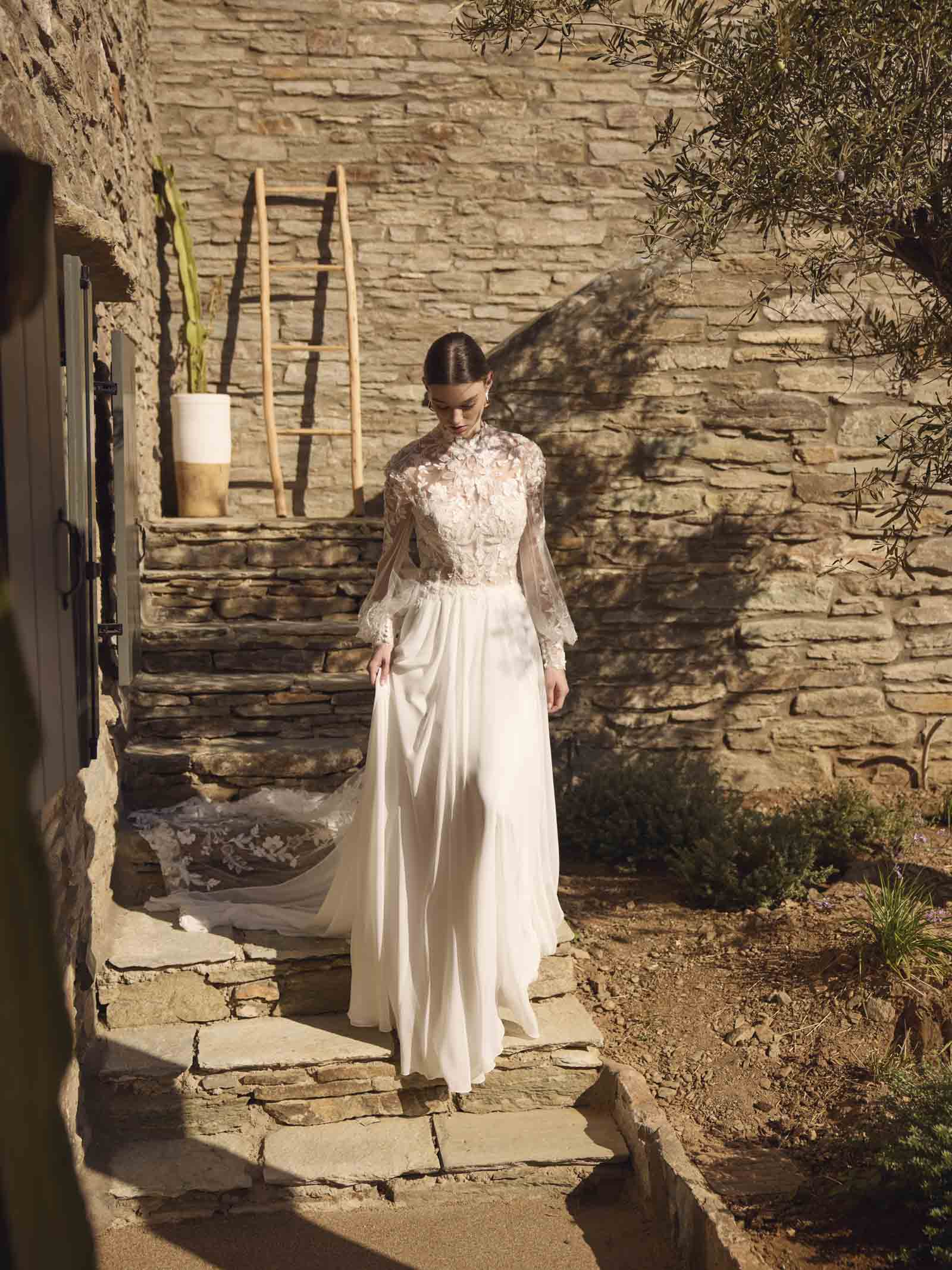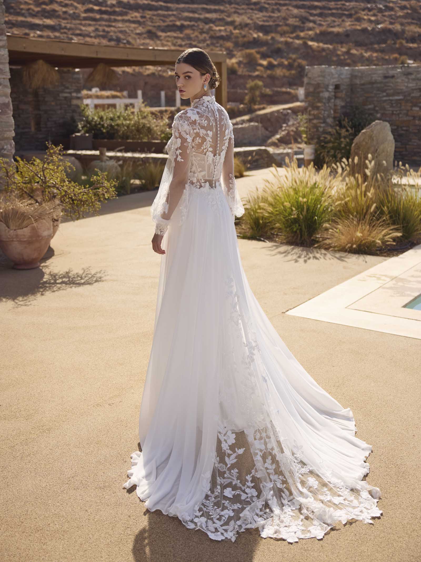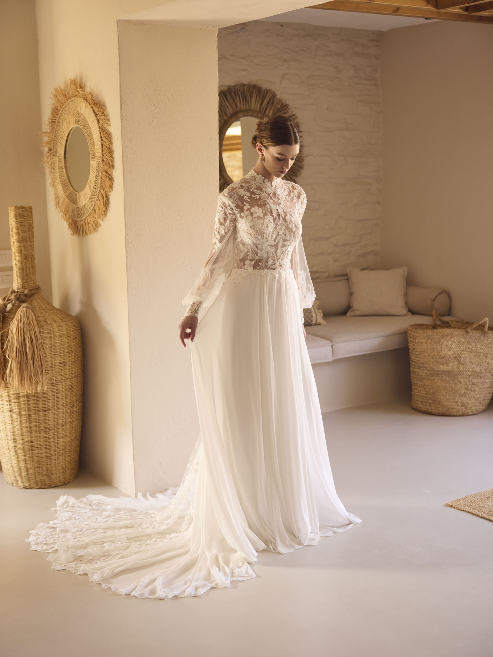 Besonderes Highlight ist der hohe Kragen, der dem Boho-Brautkleid einen royalen Touch verleiht und Deine Ausstrahlung noch majestätischer wirken lässt. Der fließende Chiffonrock fällt sanft zu Boden und bewegt sich bei jedem Schritt anmutig mit – perfekt, wenn Du einen Look suchst, der Leichtigkeit und Eleganz vereint.