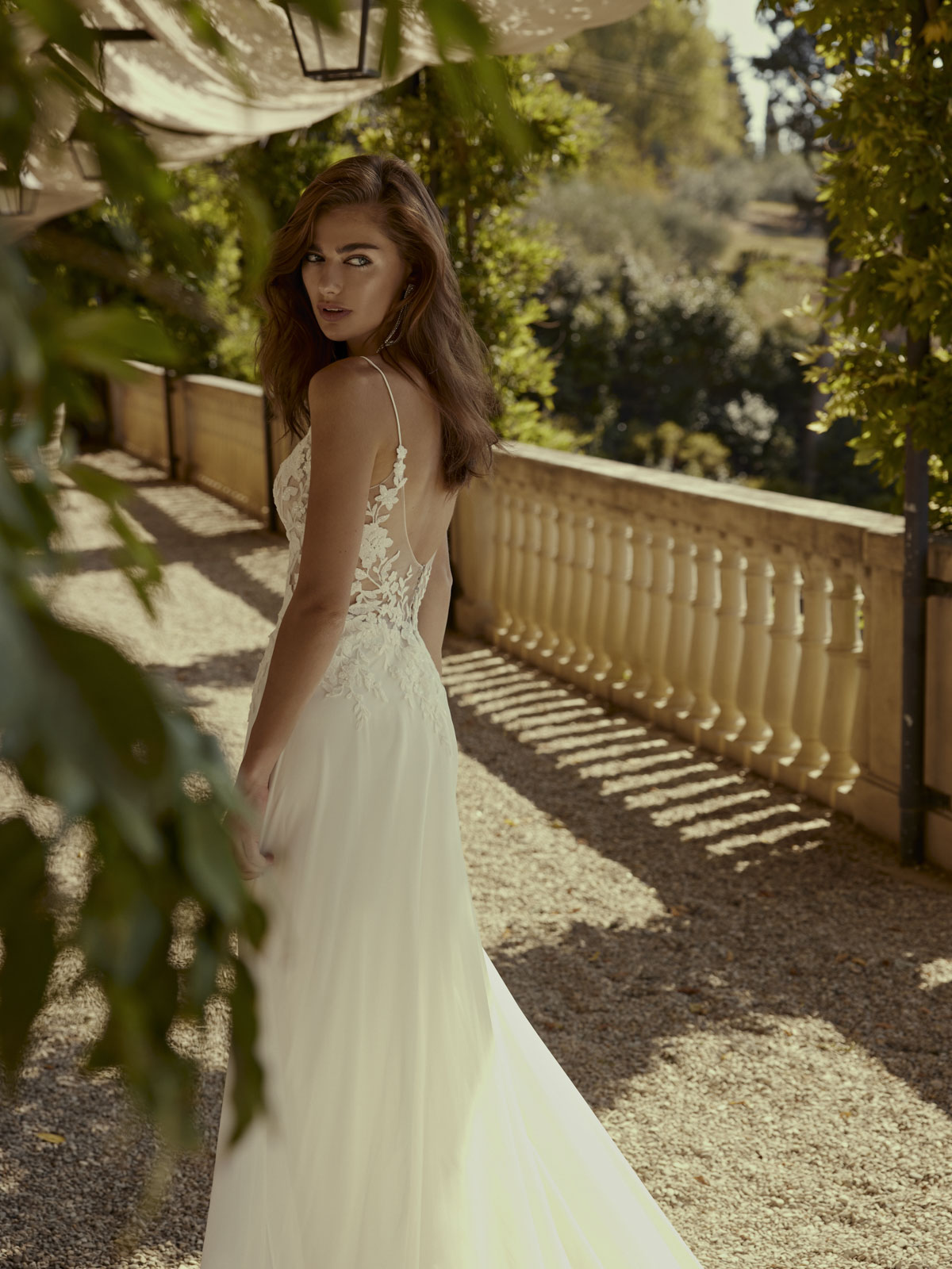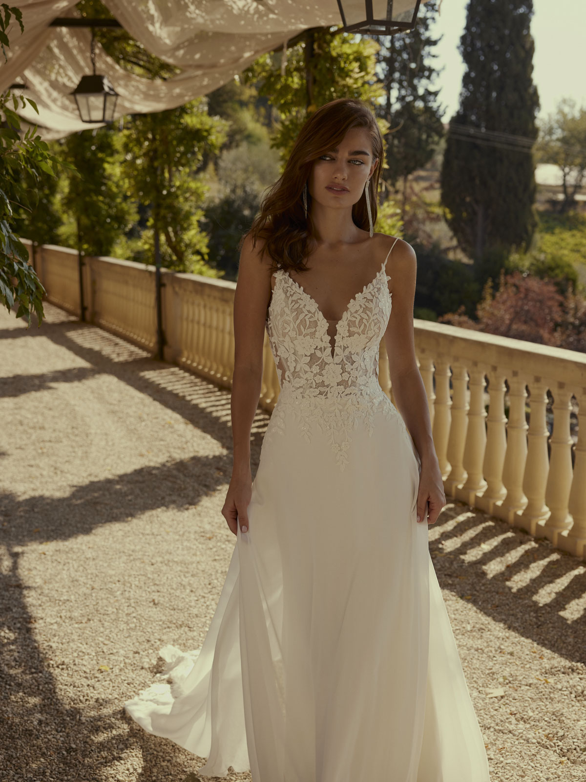 Der fließende Chiffon-Rock ergänzt das Oberteil perfekt und sorgt für einen weichen, träumerischen Look. Der Rock fällt leicht und luftig, wodurch das Kleid eine mühelose Eleganz ausstrahlt. Ideal für Bräute, die sich frei bewegen und den Tag in einem Kleid genießen möchten, das sowohl stilvoll als auch bequem ist.