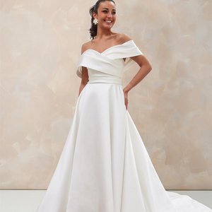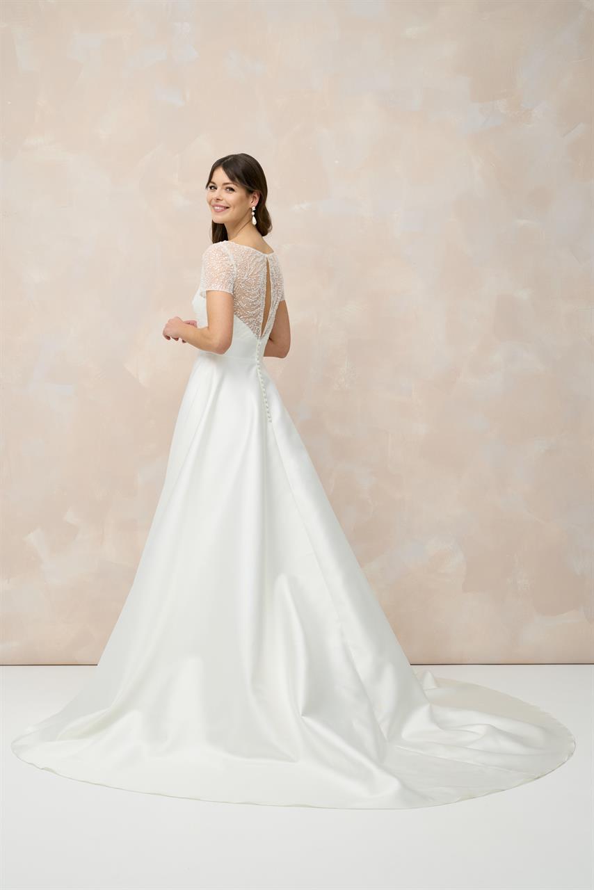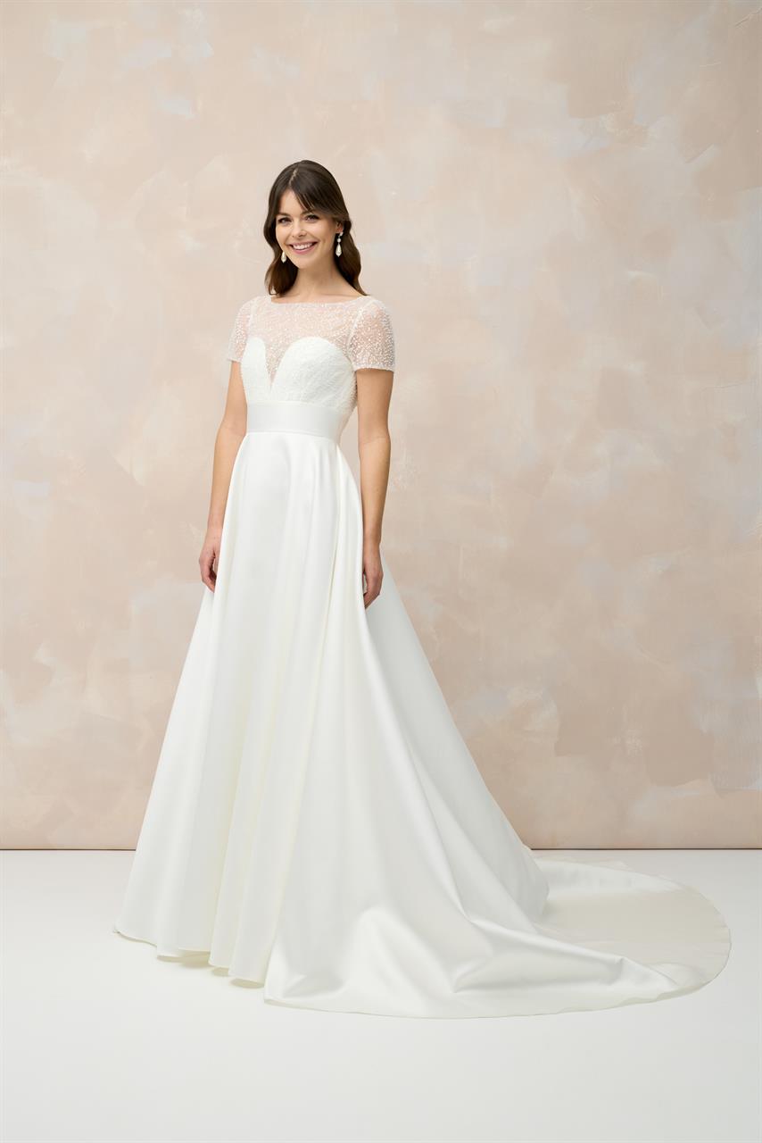 Dieses A-Linien Brautkleid ist die perfekte Wahl, wenn Du Dir einen glamourösen und gleichzeitig zeitlos-eleganten Look für Deinen großen Tag wünschst. Der Rock aus edlem Mikado fällt in klaren Linien und verleiht dem Kleid eine luxuriöse Struktur, die Dich beim Gang zum Altar erstrahlen lässt.