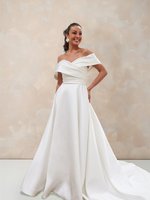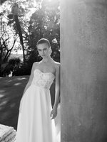 Der Rock aus edlem Mikado fließt elegant zu Boden und wird von einer zarten Knopfleiste bis in die Schleppe begleitet – ein Detail, das pure Klasse ausstrahlt. Die schimmernden Akzente der glitzernden Spitze setzen einen Hauch Glamour, ohne das Brautkleid zu überladen.