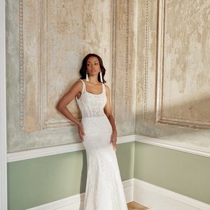 Dieses A-Linien Brautkleid vereint moderne Leichtigkeit mit kunstvoller Detailverliebtheit und einer besonders femininen Ausstrahlung. Die fein gearbeitete Corsage beeindruckt mit zarter Transparenz, eingearbeiteten Stäbchen und schimmernden Perlendetails, die dem Oberteil eine edle Tiefe und einen sanften Glanz verleihen.