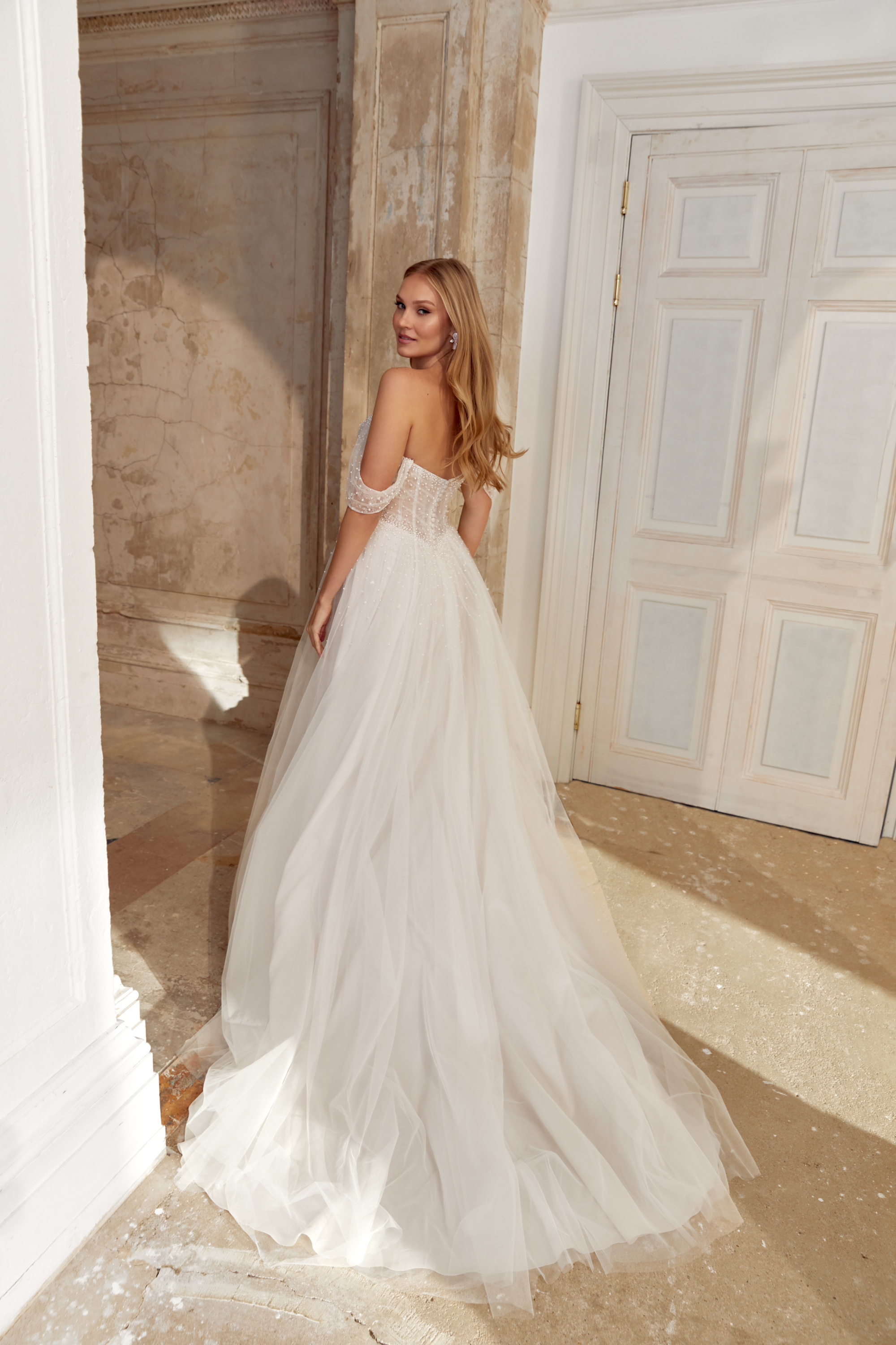 Auch die Rückenansicht begeistert mit zarter Transparenz und einer stilvollen Knopfleiste, die dem Design eine zeitlose, feminine Eleganz verleiht. Die Kombination aus transparenter Corsage, feiner Perlenveredelung und luftigem Tüll macht dieses A-Linien Brautkleid zu einer wunderschönen Wahl für Bräute, die sich am großen Tag modern, leicht und dennoch klassisch fühlen möchten.