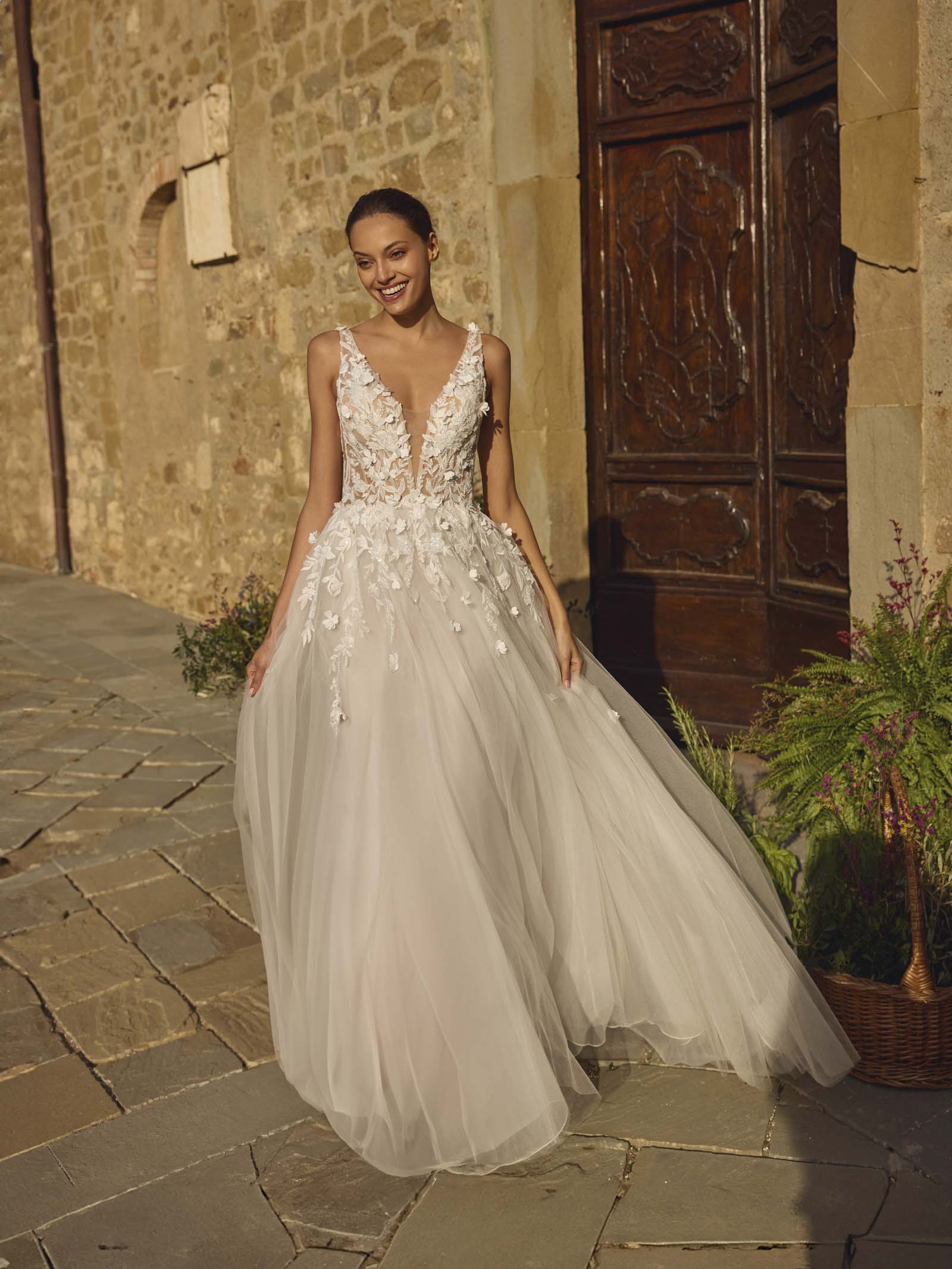 Dieses A-Linien Brautkleid von Modeca ist die perfekte Kombination aus romantischer Verspieltheit und moderner Eleganz. Der tiefe V-Ausschnitt vorne und hinten sorgt für eine feminine und gleichzeitig stilvolle Silhouette. Absolutes Highlight ist die kunstvolle 3-D Spitze, die wie kleine Blüten über das transparente Oberteil und sanft in den Tüllrock übergeht. Dadurch wirkt das Brautkleid lebendig und feminin.