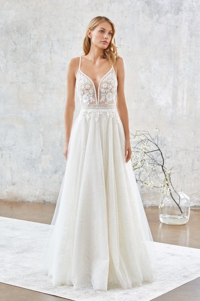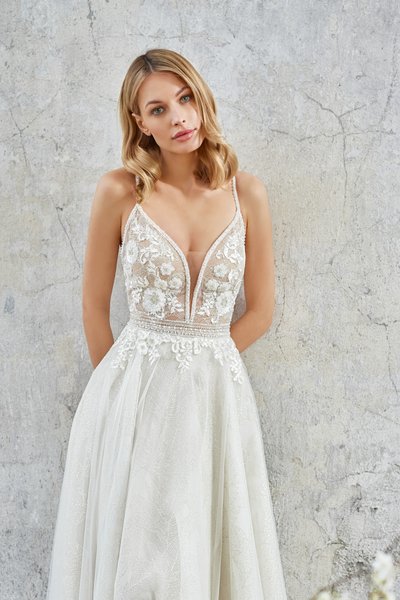 Dieses Brautkleid, eine romantische A-Linie, besticht durch seine liebevollen Details und setzt die Schönheit der Blumenapplikationen im Oberteil gekonnt in Szene. Der Ausschnitt des Kleides ist mit kleinen Perlen besetzt, die einen subtilen Glanz verleihen und das Gesamtbild elegant abrunden.