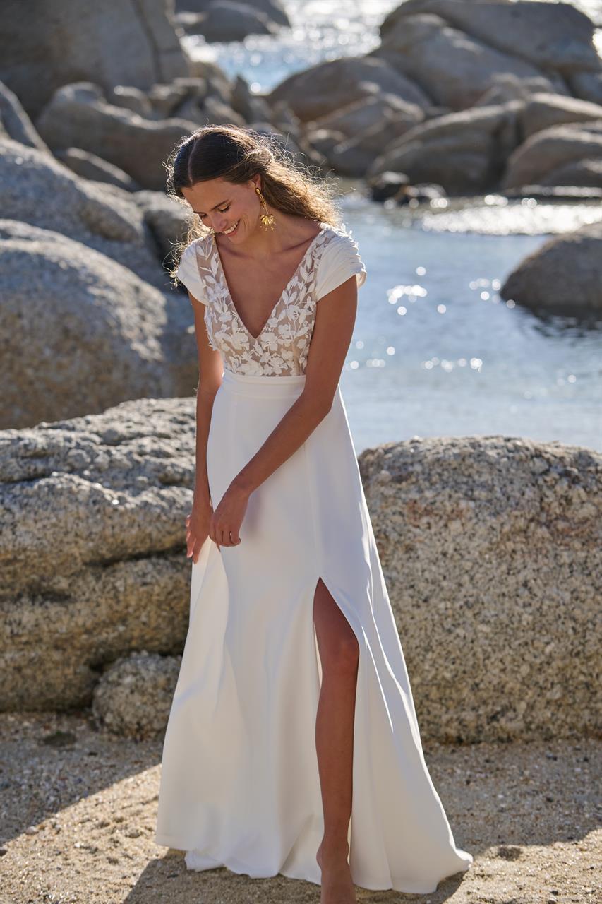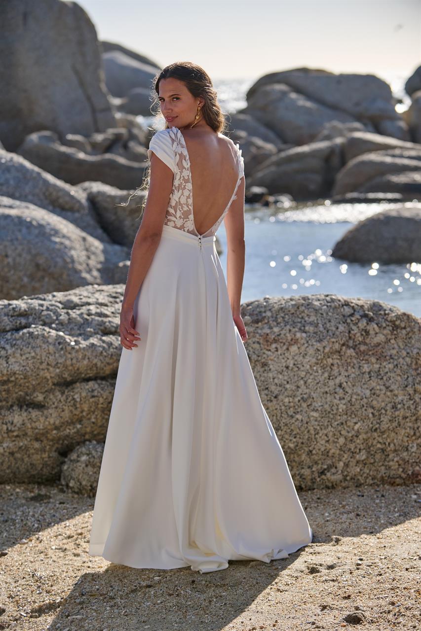 Das Oberteil des Kleides besteht aus beigefarbenem Tüll, der mit elfenbeinfarbenen Blumenapplikationen geschmückt ist. Diese floralen Details verleihen dem Oberteil eine romantische und verspielte Note, die dem klassischen Design eine moderne Frische verleiht. Der V-Ausschnitt setzt das Dekolleté auf elegante Weise in Szene, während die kurzen Ärmel aus Crepe dem Kleid eine zarte und feminine Ausstrahlung verleihen. Der tiefe, offene Rücken sorgt für eine sinnliche Note und rundet den Look mit einem Hauch von Verführung ab.