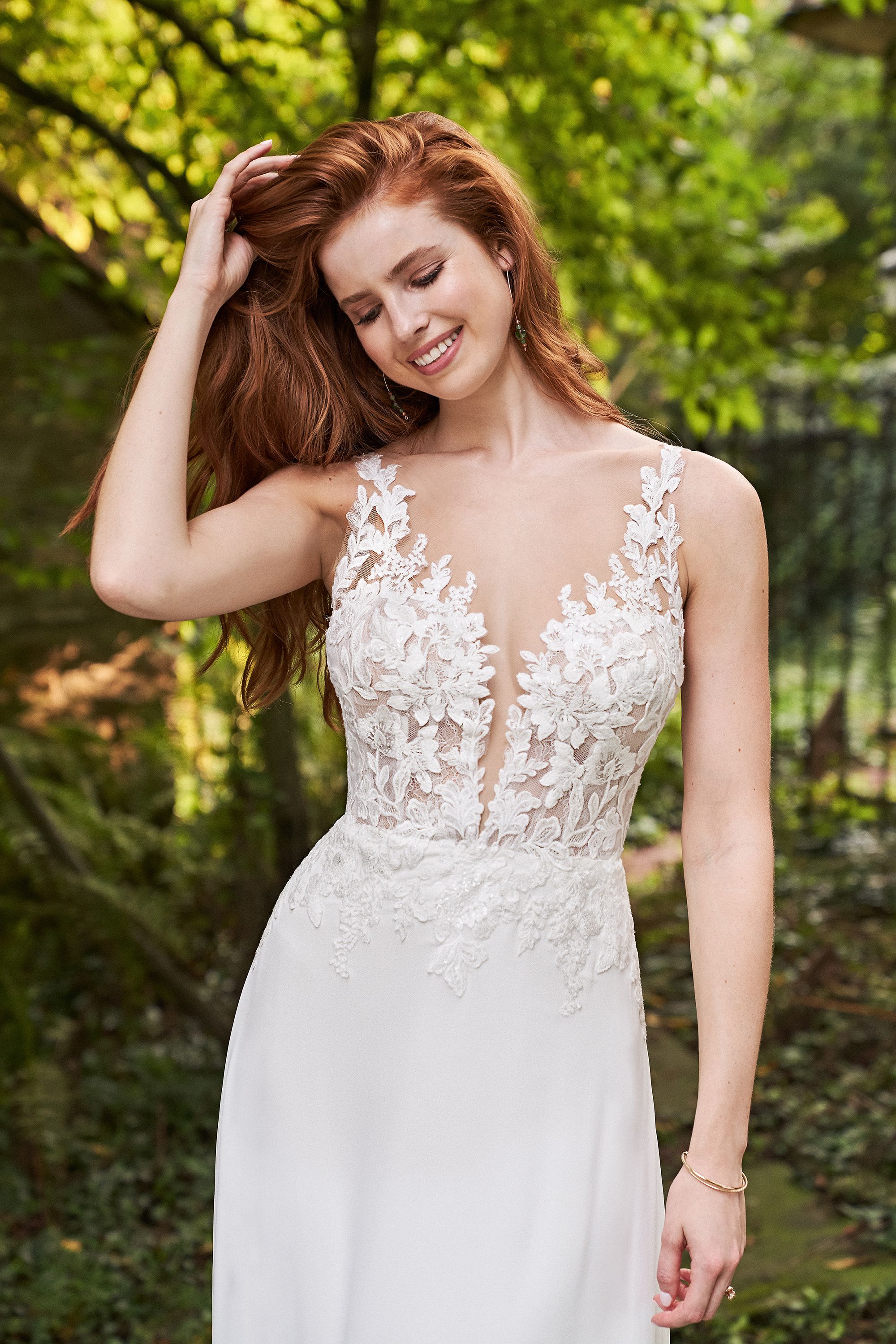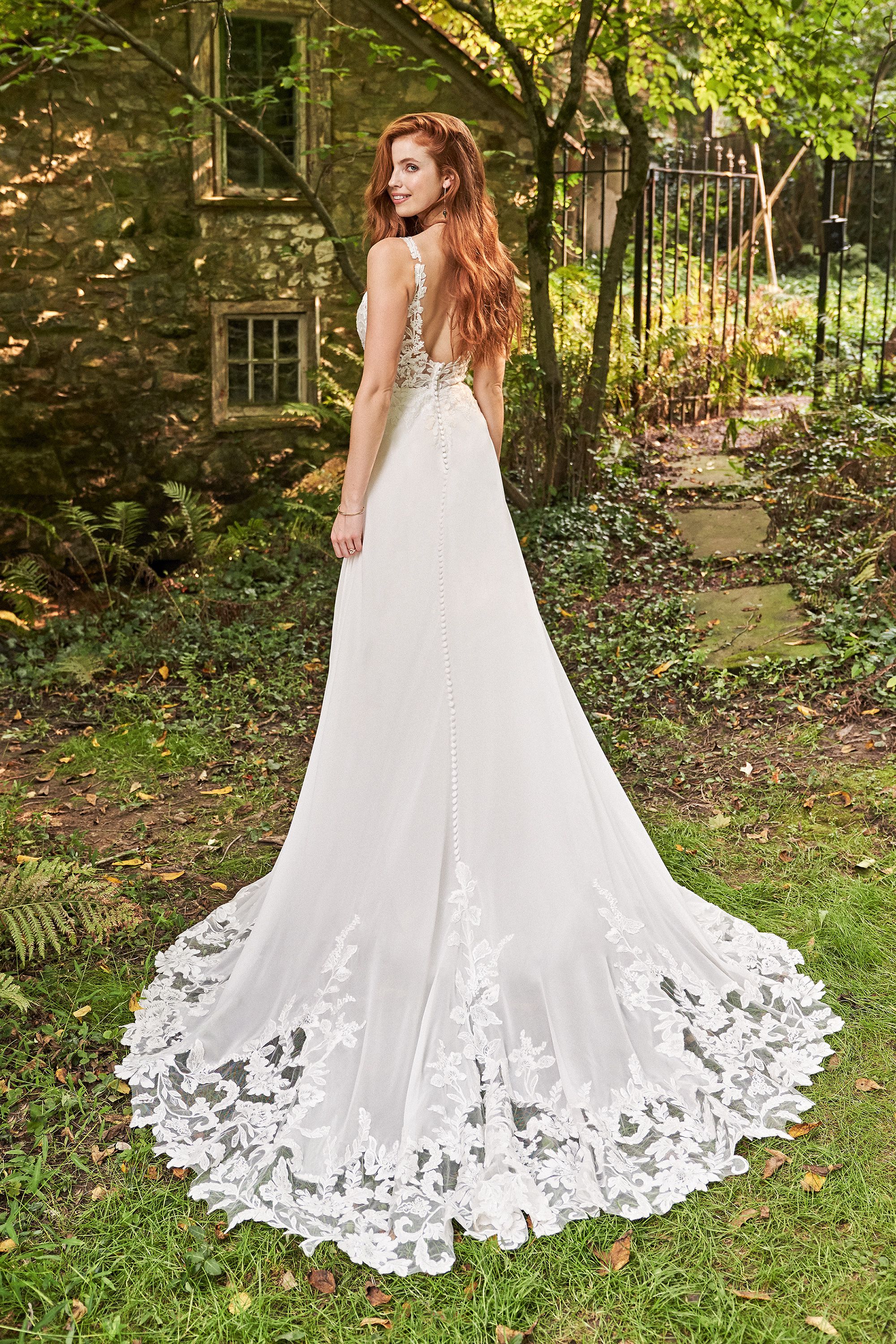 Mühelos und romantisch, in diesem Chiffon-Brautkleid in A-Linie werden Sie sich wie eine Braut fühlen. Es verfügt über einen tiefen Illusions-Ausschnitt, der sich perfekt an Ihre Haut anpasst, wodurch die paillettenbesetzten Spitzenapplikationen entlang des Ausschnitts bis zu den Trägern zu schweben scheinen. Eine Unterlage aus Chantilly-Spitze im transparenten Mieder sorgt für einen Hauch von zusätzlichen Details. Applikationen fallen auf den fließenden Chiffonrock herab und setzen sich fort, um eine atemberaubende Schleppe in Kapellenlänge zu schaffen. Es ist komplett mit einem sexy V-Rücken, der mit überzogenen Knöpfen akzentuiert ist, die bis zum Anfang der Schleppe herabfallen.
