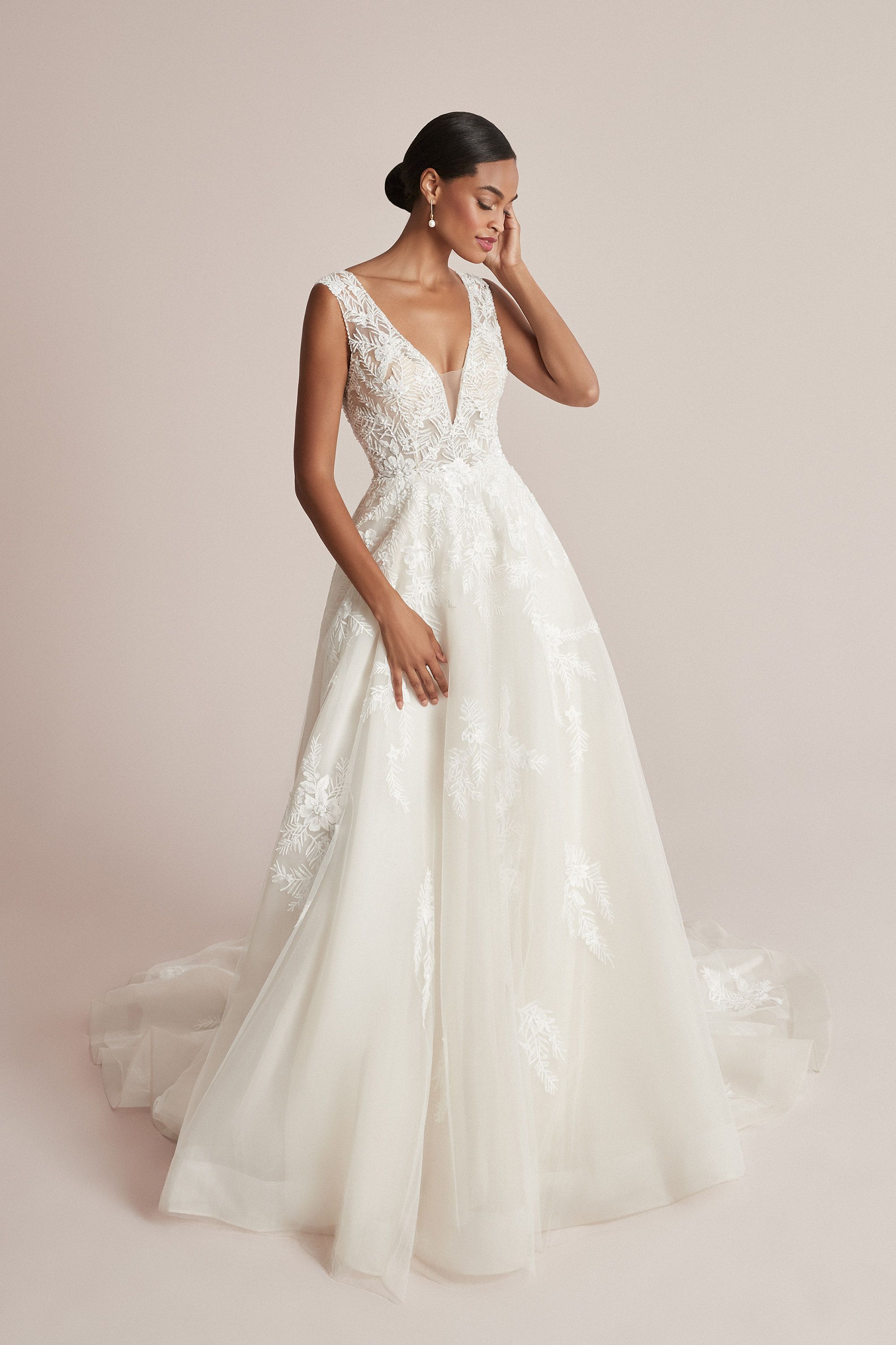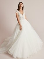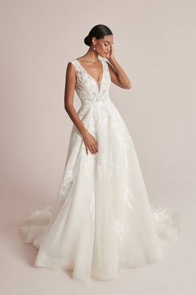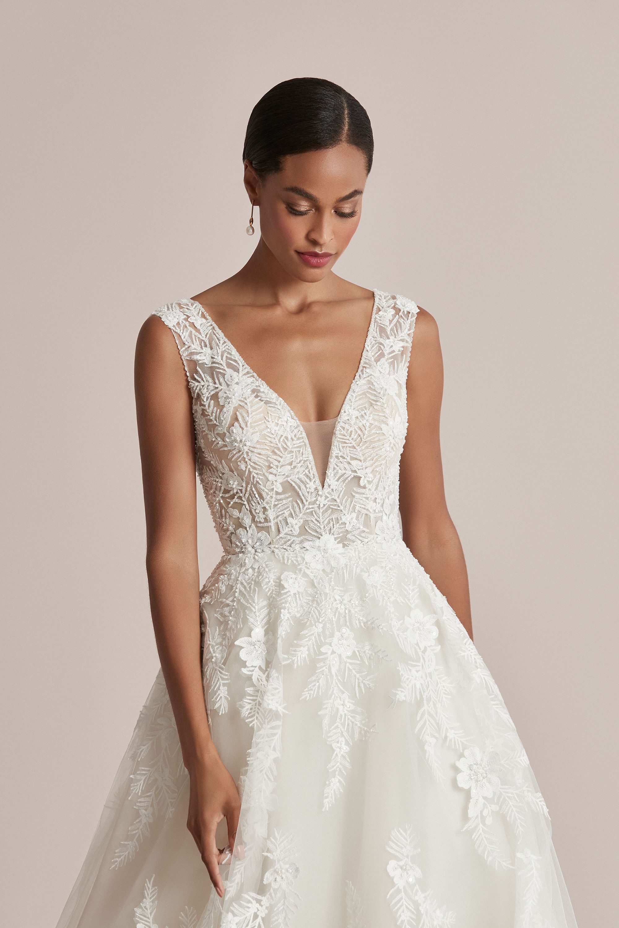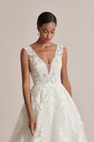 A-Linien-Brautkleid mit leichtem fließendem Softtüll-Rock. Das Oberteil ist mit floraler Illusion-Spitze versehen und hat handgestickte Perlen-Applikationen.