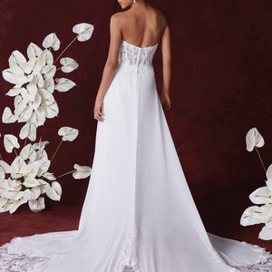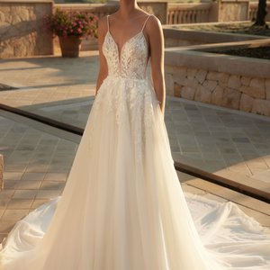 Der Rock endet in einer langen, fließenden Schleppe, die bei jedem deiner Schritte eine bezaubernde Bewegung erzeugt und deinem Auftritt eine besondere Anmut verleiht. Dein Brautkleid ist weit mehr als nur ein Kleidungsstück – es ist ein Kunstwerk aus edelsten Materialien und feinen Details, das deine Schönheit auf einzigartige Weise unterstreicht und deine Hochzeit zu einem unvergesslichen Ereignis machen wird, von dem du noch lange träumen wirst.