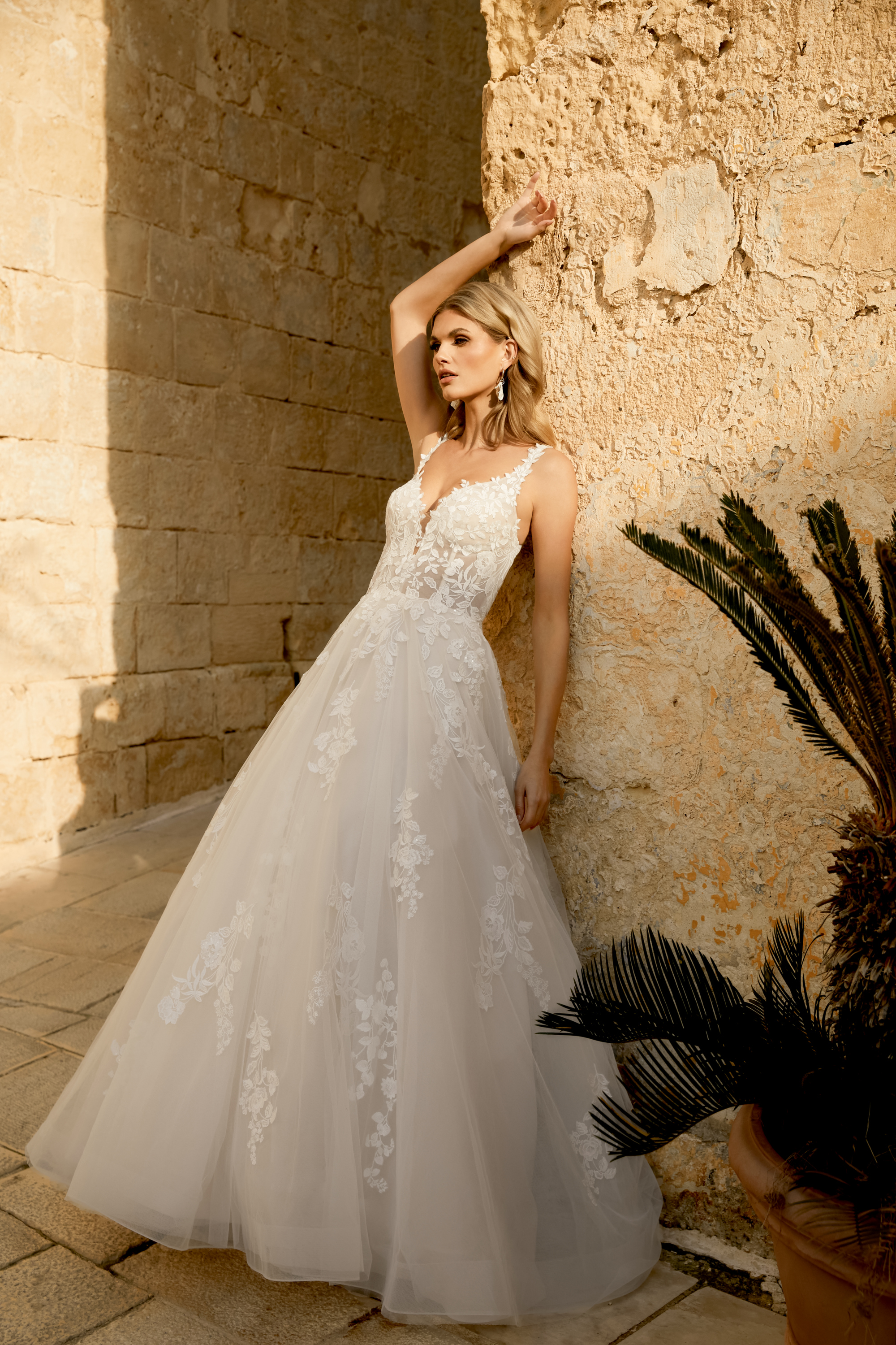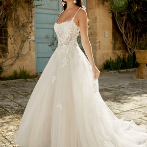 Die spektakuläre Rückenpartie, die mit zarten Spitzenapplikationen verziert ist, sorgt für einen unvergesslichen Auftritt und setzt einen modernen Akzent, der das klassische Design des Kleides auflockert. Die sorgfältig platzierten 3D-Blumen verleihen dem Kleid eine natürliche Anmut und fügen eine zusätzliche Dimension hinzu, die das Kleid besonders romantisch und einzigartig macht.