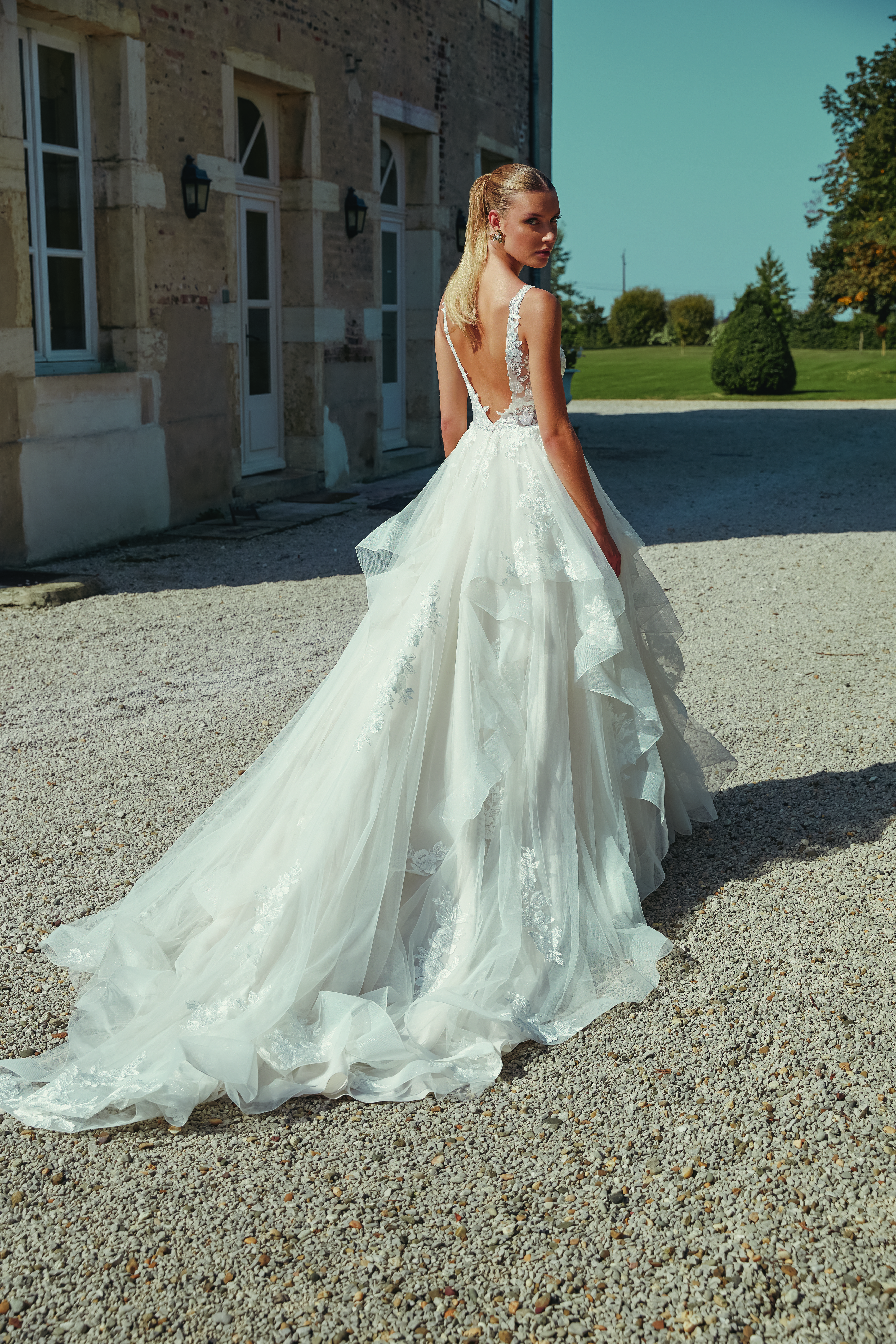 Die wahre Pracht dieses Kleides zeigt sich jedoch im Rock. Der voluminöse Rüschenrock besteht aus mehreren Lagen, die dem Kleid eine unglaubliche Struktur und Bewegung verleihen. Bei jedem Schritt wirbelt der Rock majestätisch und sorgt für einen dramatischen Auftritt. Der weiche Tüll, kombiniert mit den glitzernden Pailletten, lässt das Kleid in jedem Licht erstrahlen und sorgt dafür, dass Du an Deinem großen Tag im Mittelpunkt stehst.