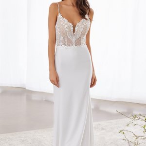 Ein Illusions-Ausschnitt formt ein atemberaubendes Dekolleté und verleiht der Braut eine zeitlose Schönheit. Das Spiel von Perlenapplikationen setzt funkelnde Akzente, die den Ausschnitt vorne, unter den Armen und entlang der Träger zieren, und somit einen subtilen Glanz verleihen.