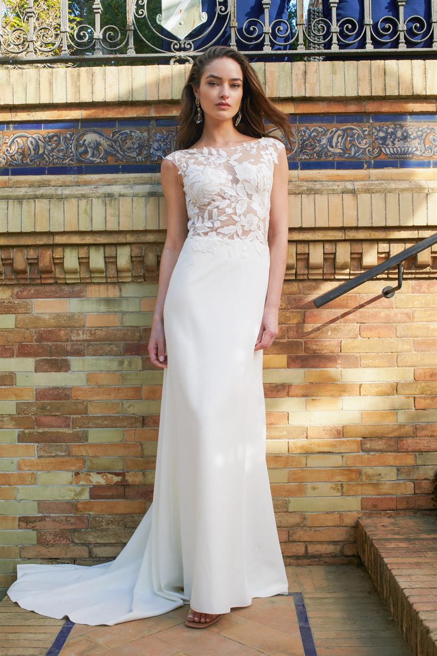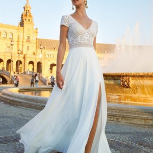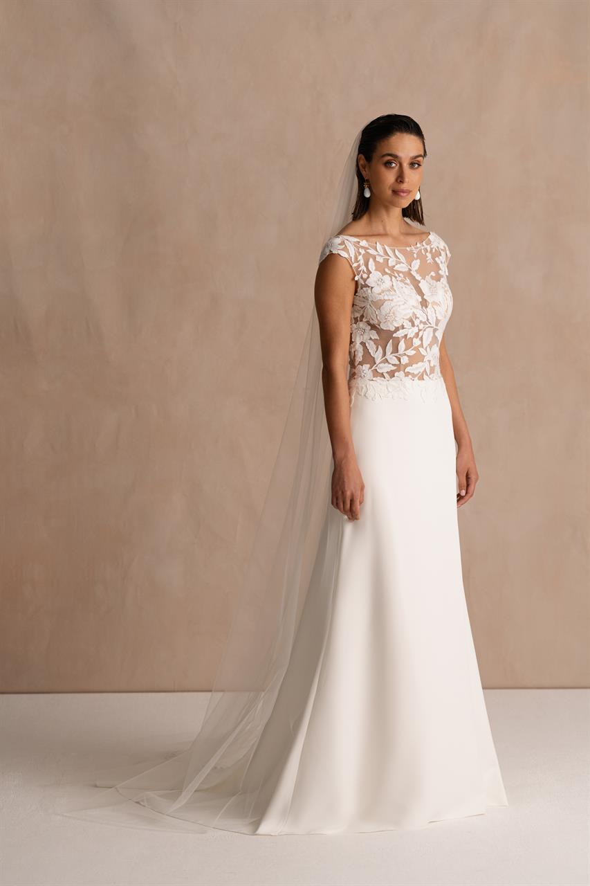 Dieses Kleid ist ideal für Bräute, die eine Kombination aus romantischen Details und einer modernen, figurschmeichelnden Silhouette suchen. Die elfenbeinfarbenen Blumenstickereien, der weiche Tüll und der fließende Crepe-Rock machen dieses Kleid zu einer hervorragenden Wahl für elegante, klassische oder moderne Hochzeiten.