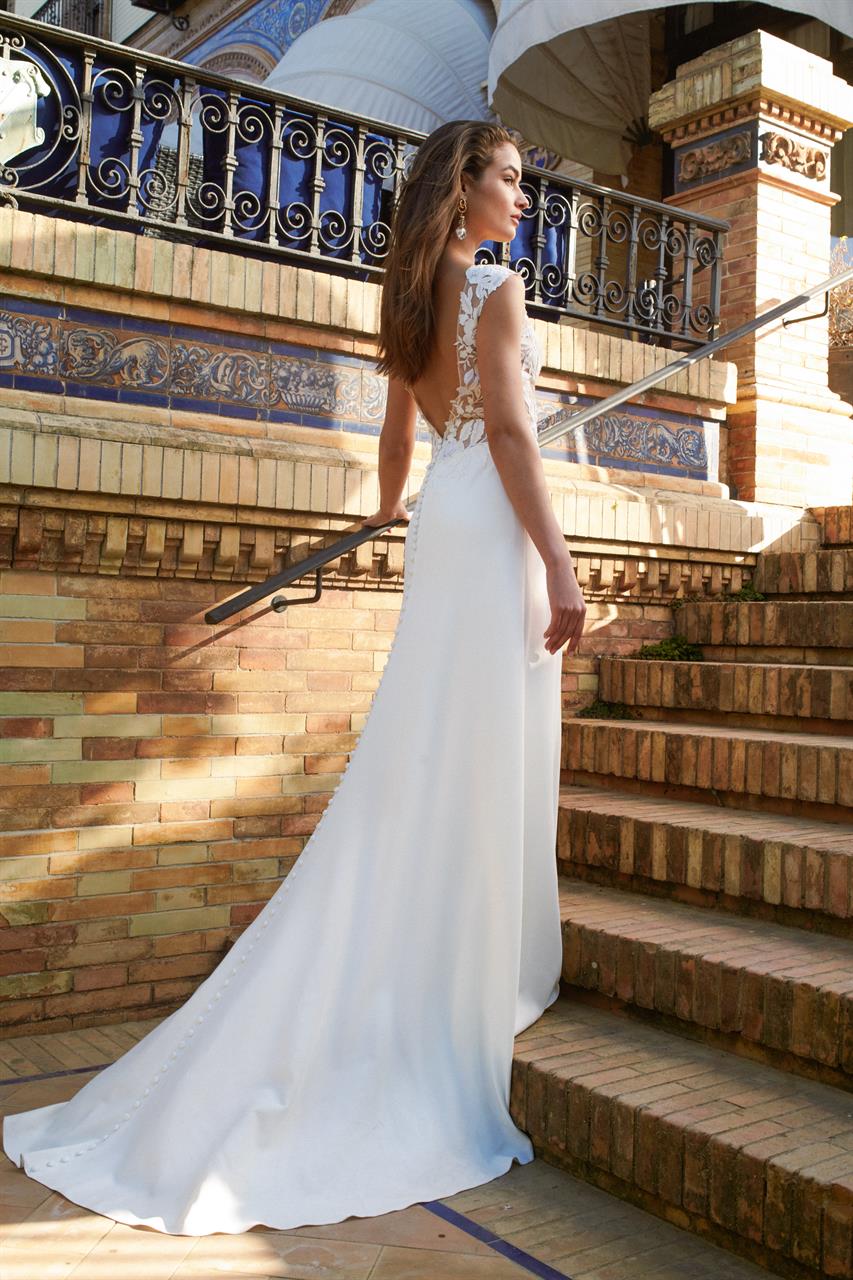 Der Rock ist aus hochwertigem Crepe gefertigt und schmiegt sich in einer Meerjungfrau-Silhouette elegant an Deine Kurven. Ab dem Knie fließt der Rock sanft in eine ausladende Form, die eine perfekte Balance zwischen Figurbetonung und Eleganz bietet. Die Kapellenschleppe rundet den Look majestätisch ab und sorgt für einen eindrucksvollen Auftritt beim Gang zum Altar.