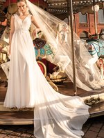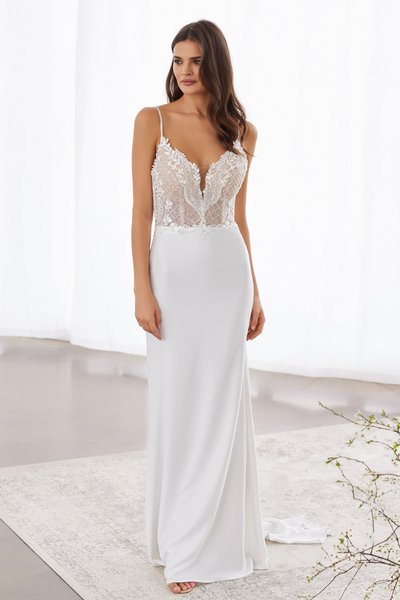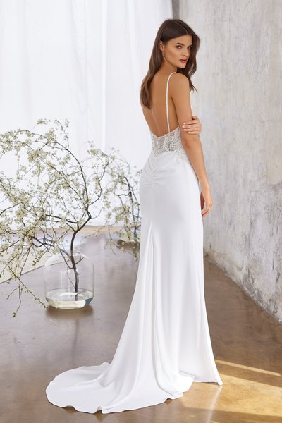 Der Übergang zum Rock wird von zarter Blütenspitze unterstützt, die nahtlos in einen schlichten Jersey-Rock mit einer eleganten Schleppe übergeht. Dieses Kleid ist die perfekte Wahl für die moderne Braut, die Sinnlichkeit und Eleganz in einem bezaubernden Look vereinen möchte.