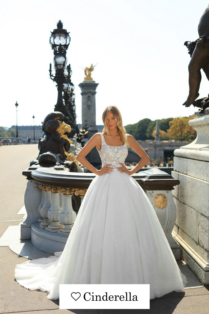 Dieses Brautkleid besticht durch eine Kombination aus filigraner Spitze und einem sanft fallenden Rock, der für eine anmutige und zeitlose Ausstrahlung sorgt. Das Oberteil ist mit floralen Applikationen aus Spitze versehen, die sich kunstvoll über das transparente Mieder erstrecken und dem Design eine raffinierte Note verleihen. Breite Träger bieten perfekten Halt und rahmen das Dekolleté mit einem eleganten V-Ausschnitt wunderschön ein.