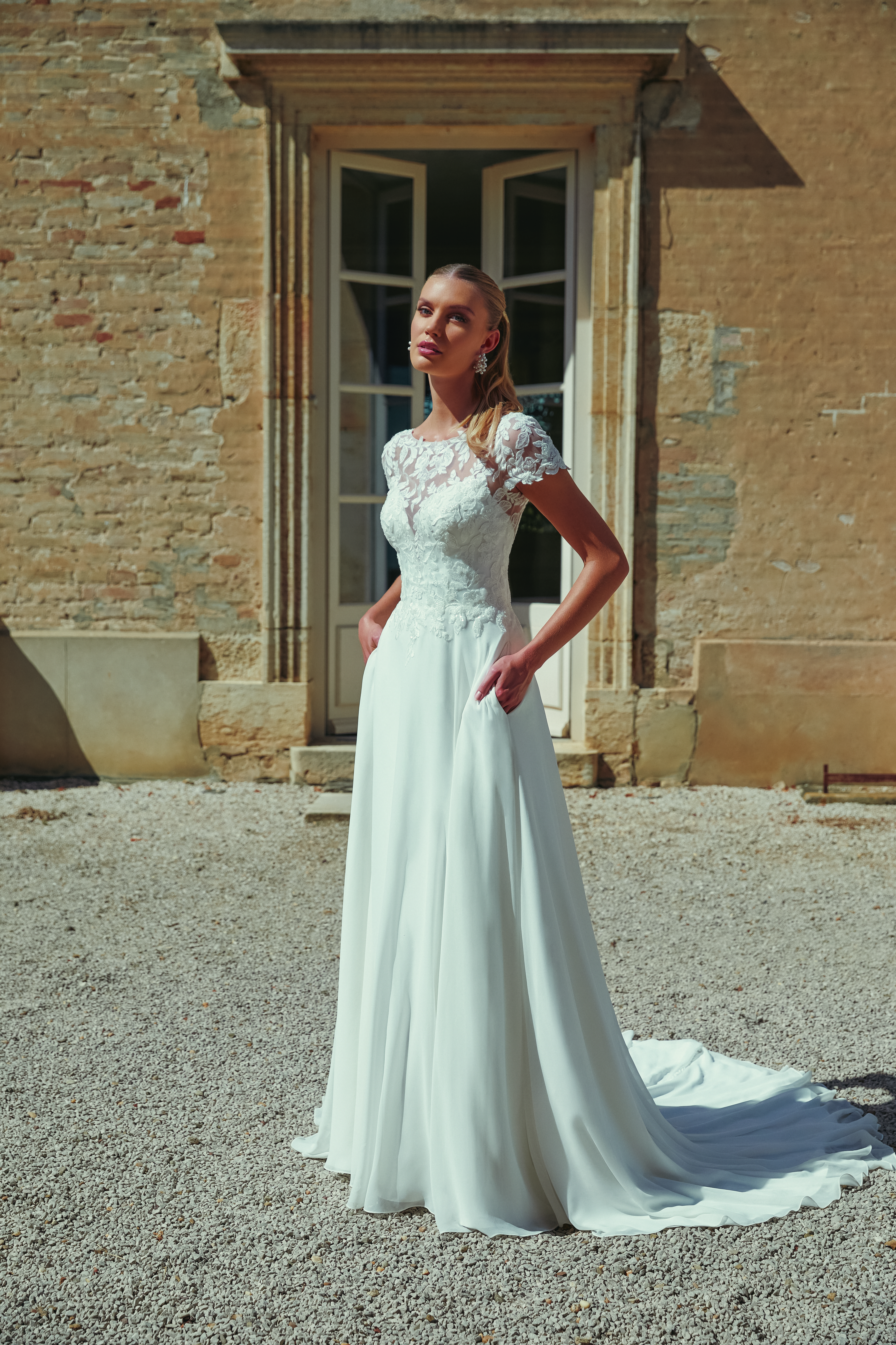Dieses Kleid ist eine hervorragende Wahl für eine Hochzeit im Freien, eine Sommerhochzeit oder eine elegante Feier in einem festlichen Saal. Es vereint klassische Elemente mit modernen Details und sorgt so dafür, dass Du an Deinem großen Tag im Mittelpunkt stehst und Dich rundum wohlfühlst.