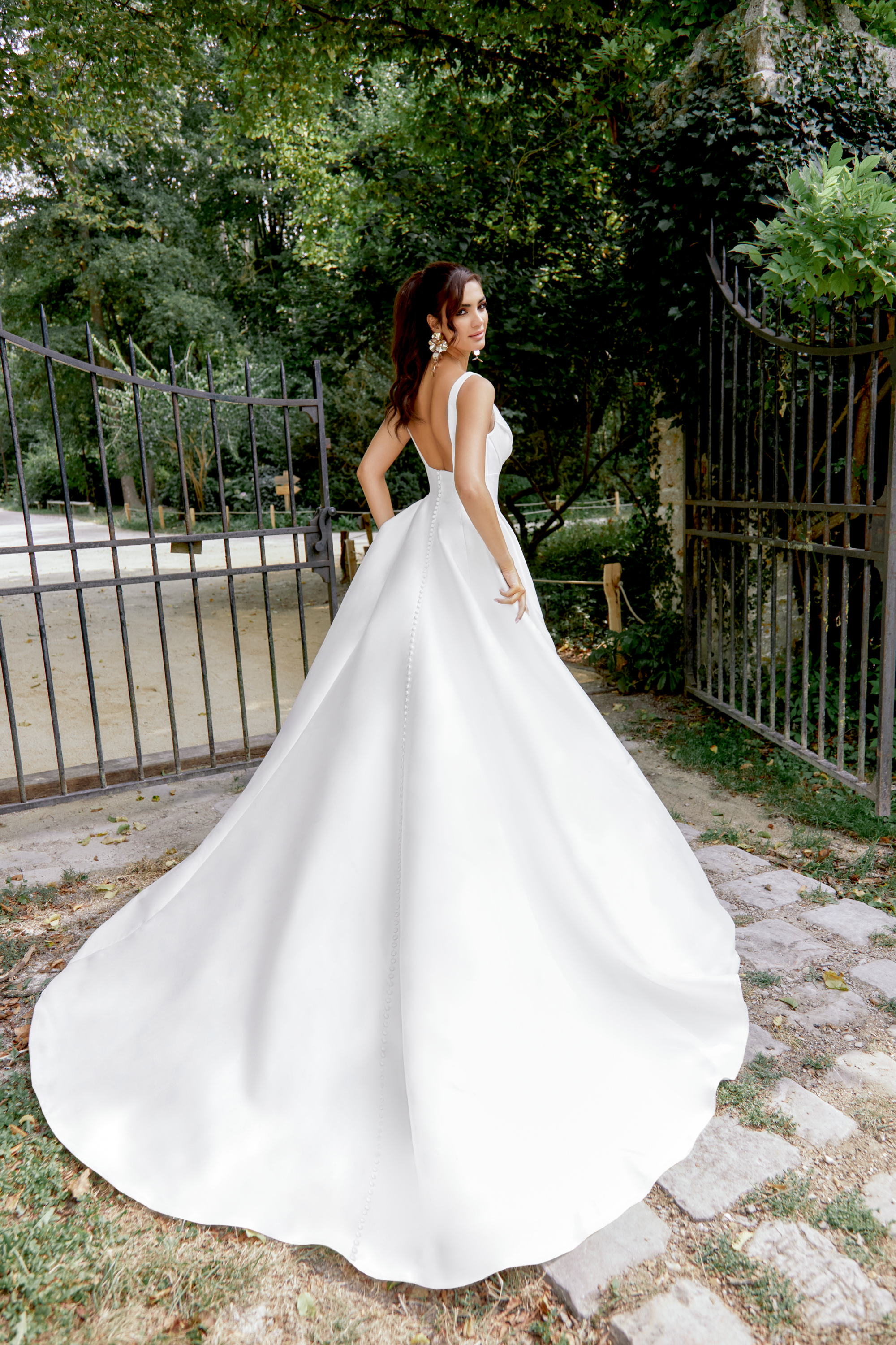 Der hochgeschlossene, leicht drapierte Ausschnitt wirkt stilvoll und raffiniert zugleich und setzt Dein Dekolleté dezent in Szene. Die betonte Taille zaubert eine wunderschöne Silhouette, während der fließende Rock in A-Linie mit seiner leichten Schleppe für den großen Auftritt sorgt. Besonders charmant: die durchgehende Knopfleiste am Rücken und der tiefe Rückenausschnitt – clean, aber mit Wow-Faktor.