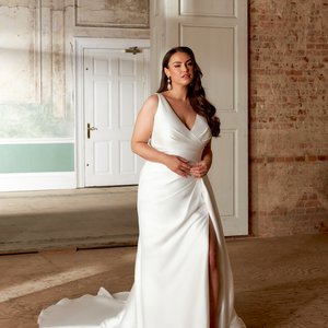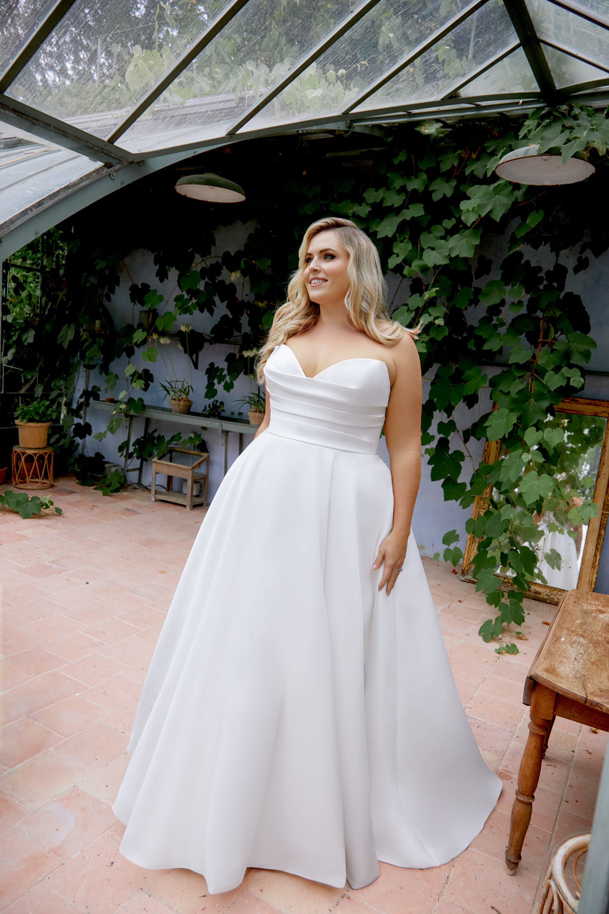 Der edle Mikado-Stoff verleiht dem Brautkleid eine cleane Struktur und einen luxuriösen Glanz, der besonders im Sonnenlicht wunderschön zur Geltung kommt. Auch in der Variante für unsere Curvy-Bräute verliert dieses Hochzeitskleid in keiner Weise an Eleganz und Wirkung. Ganz im Gegenteil: Der figurbetonte, geraffte Herzausschnitt sorgt für ein feminines Dekolleté, während die A-Linie ab der Taille sanft ausgestellt ist und Deine Silhouette wunderschön umschmeichelt.