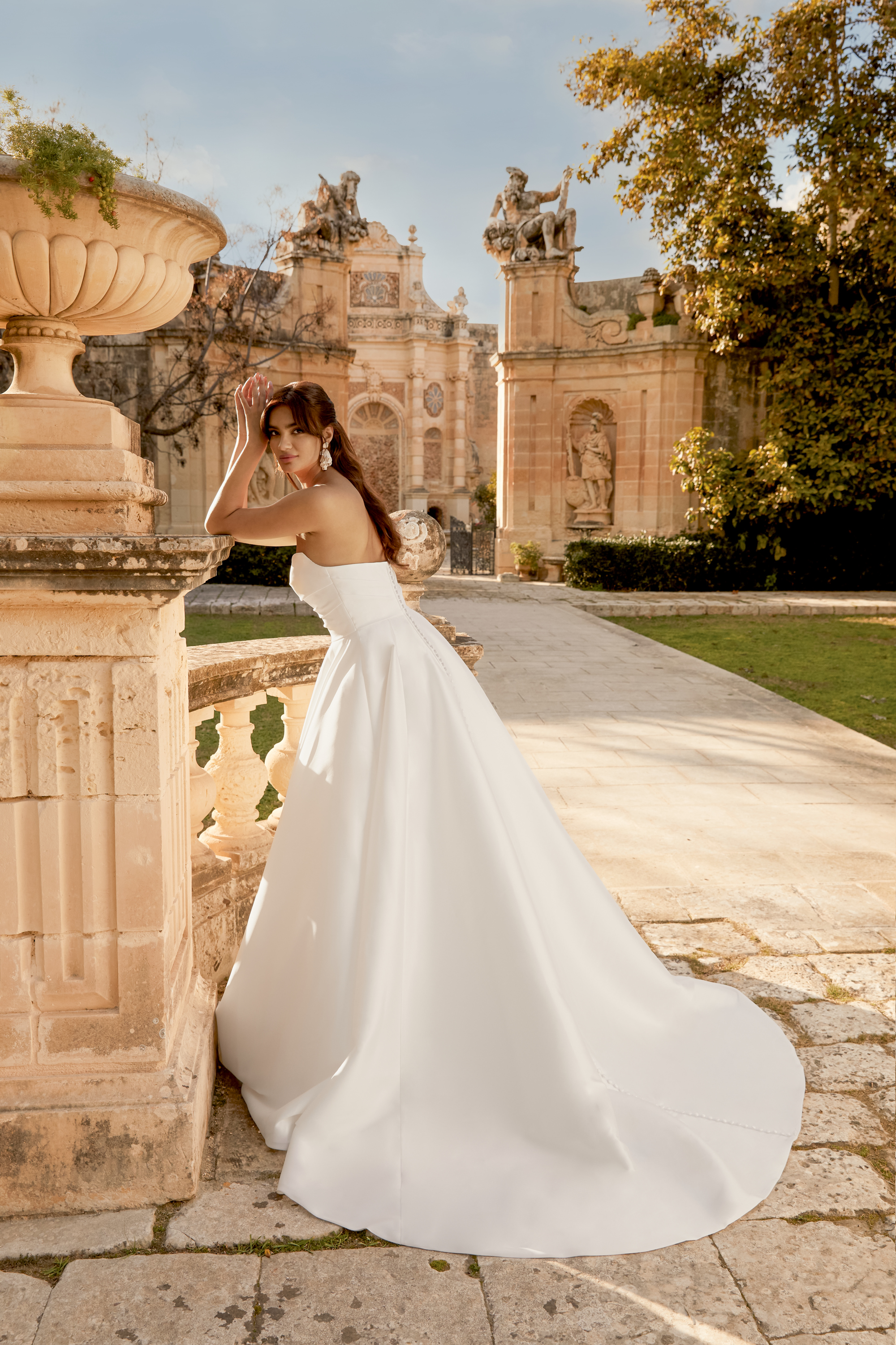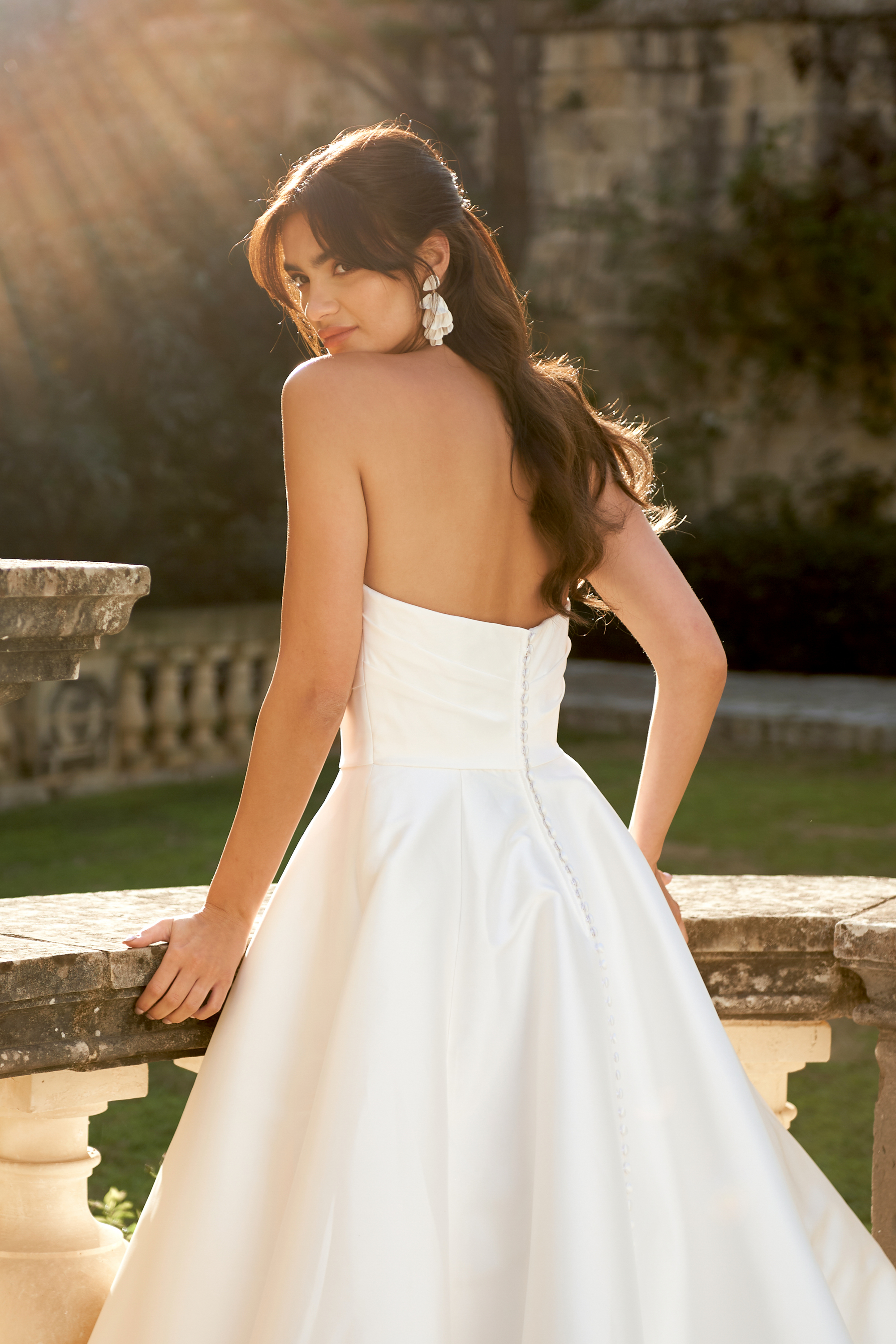 Vorne schlicht und formvollendet, hinten mit einer durchgehenden Knopfleiste bis zur Schleppe – dieses elegante A-Linien-Brautkleid verbindet klassische Eleganz mit modernem Design. Das cleane Brautkleid kommt ganz ohne Spitze oder Applikationen aus und wirkt gerade deshalb so stilvoll und selbstbewusst.