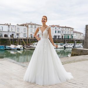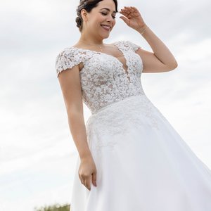 Wenn Du Dich in einem Kleid sehen möchtest, das zeitlos, stilvoll und gleichzeitig jung und modern wirkt, solltest Du dieses Modell unbedingt anprobieren. In unserem Cinderella Store für Brautmode Köln wartet dieses cleane Traumkleid auf Dich.
