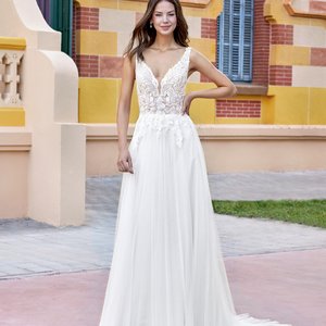 Der glatte Crepe-Stoff schmiegt sich perfekt an Deine Figur an und betont Deine Silhouette auf elegante Weise. Der tiefe V-Ausschnitt und die feinen dünnen Träger verleihen dem Brautkleid Leichtigkeit und lassen Dich strahlen, ohne zu viel zu verraten.