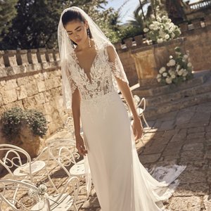 Dieses elegante Brautkleid verbindet modernes Design mit romantischen Details. Die Fit and Flare Silhouette betont die Figur auf schöne Weise und sorgt für eine feminine, elegante Ausstrahlung. Der hochwertige Stoffmix aus Mikado und Crêpe fällt wunderschön und wirkt besonders edel.