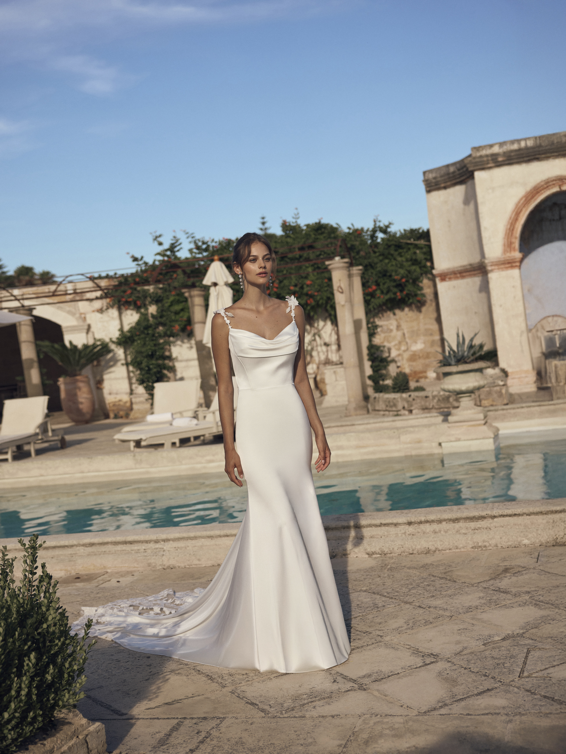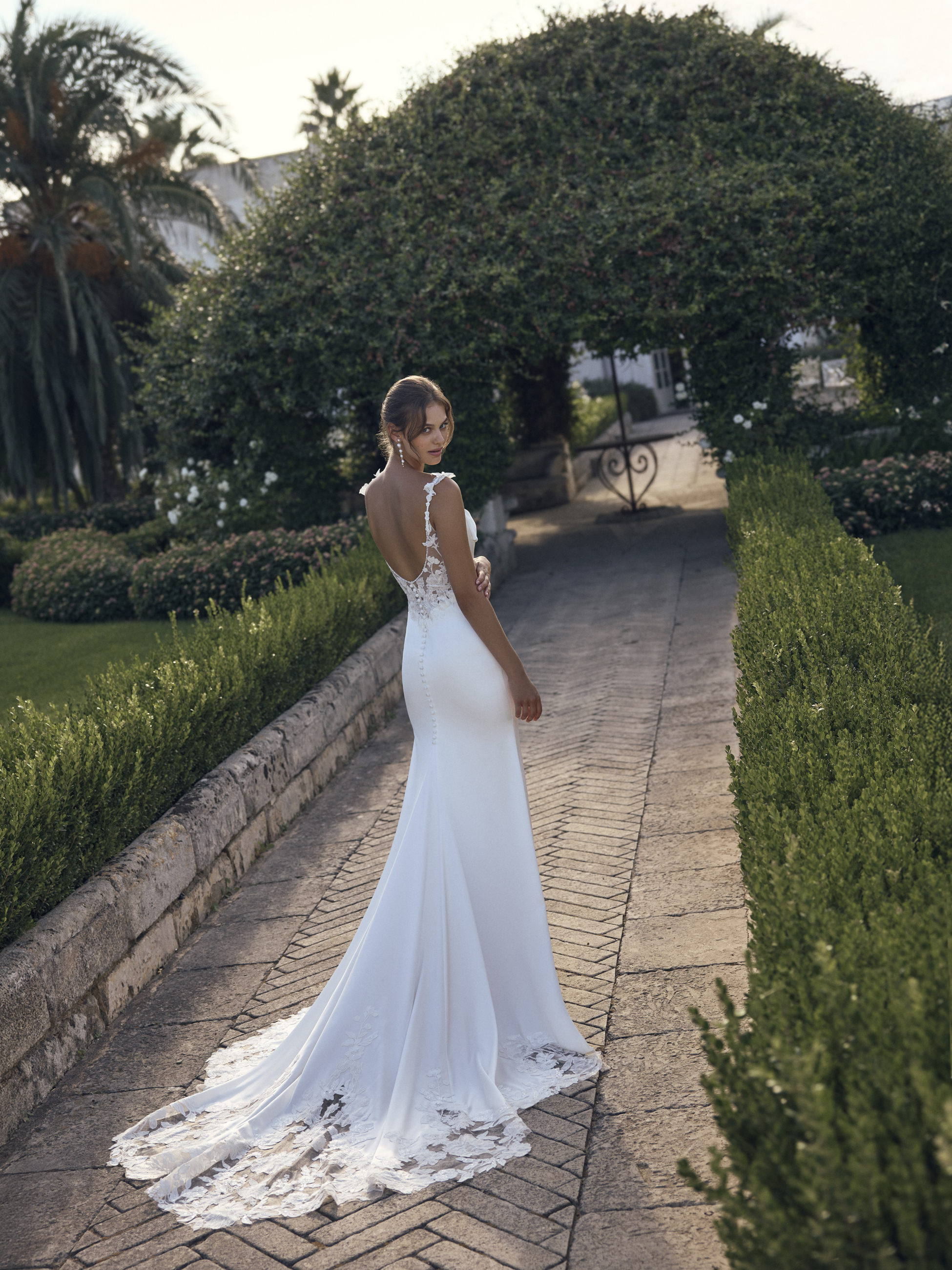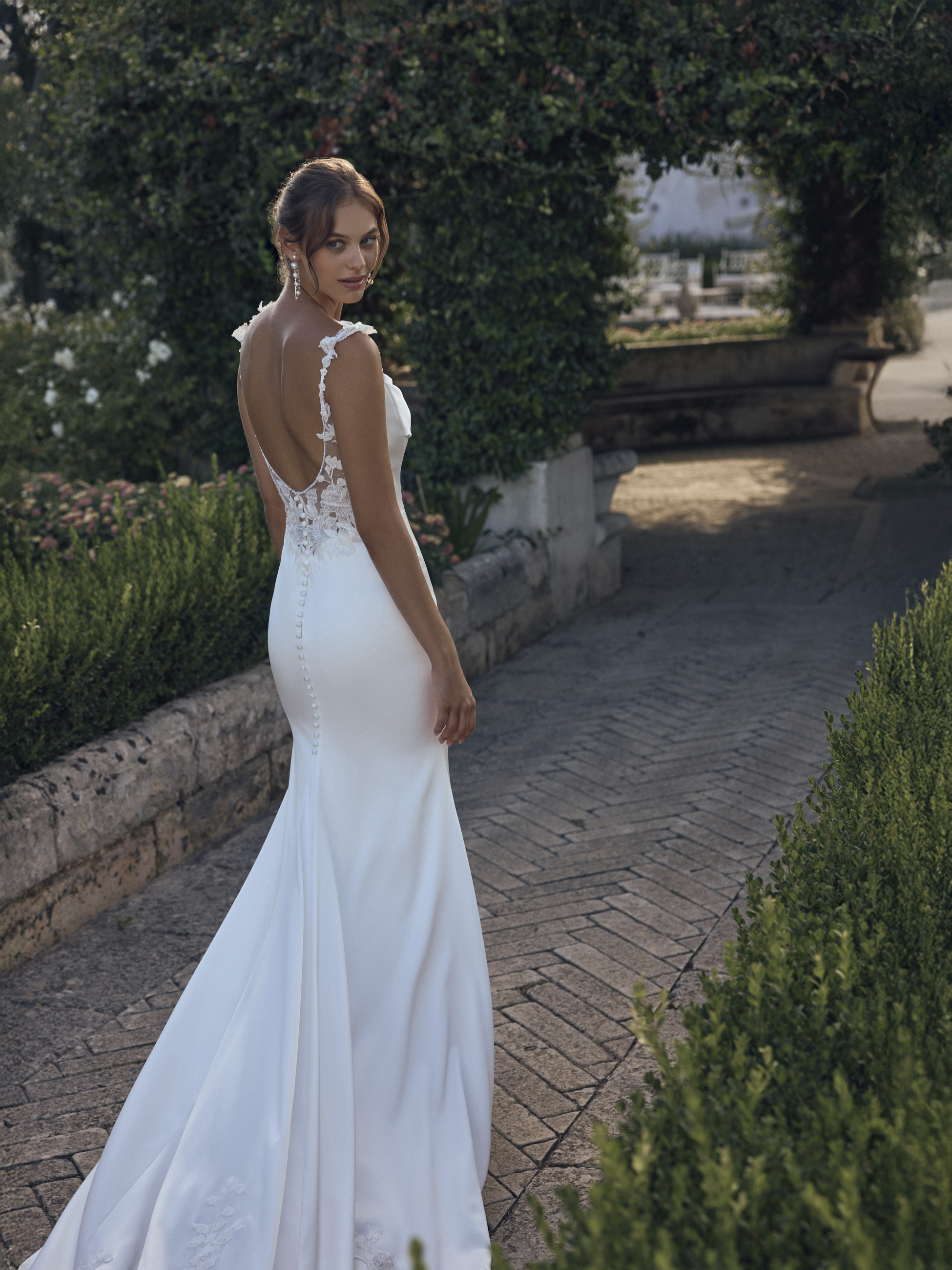 Der tiefe Rückenausschnitt macht das Brautkleid zu einem echten Blickfang und verleiht dem Look eine stilvolle, feminine Note. Feine florale Spitzendetails an den Trägern und am Rücken setzen zarte Akzente.