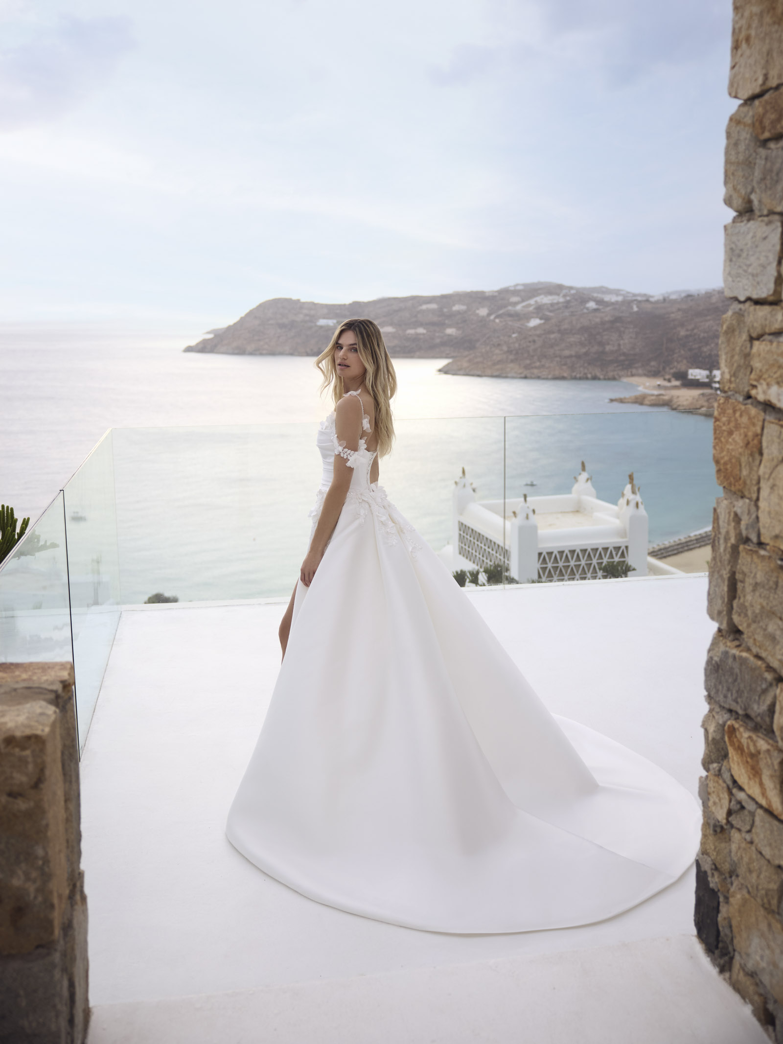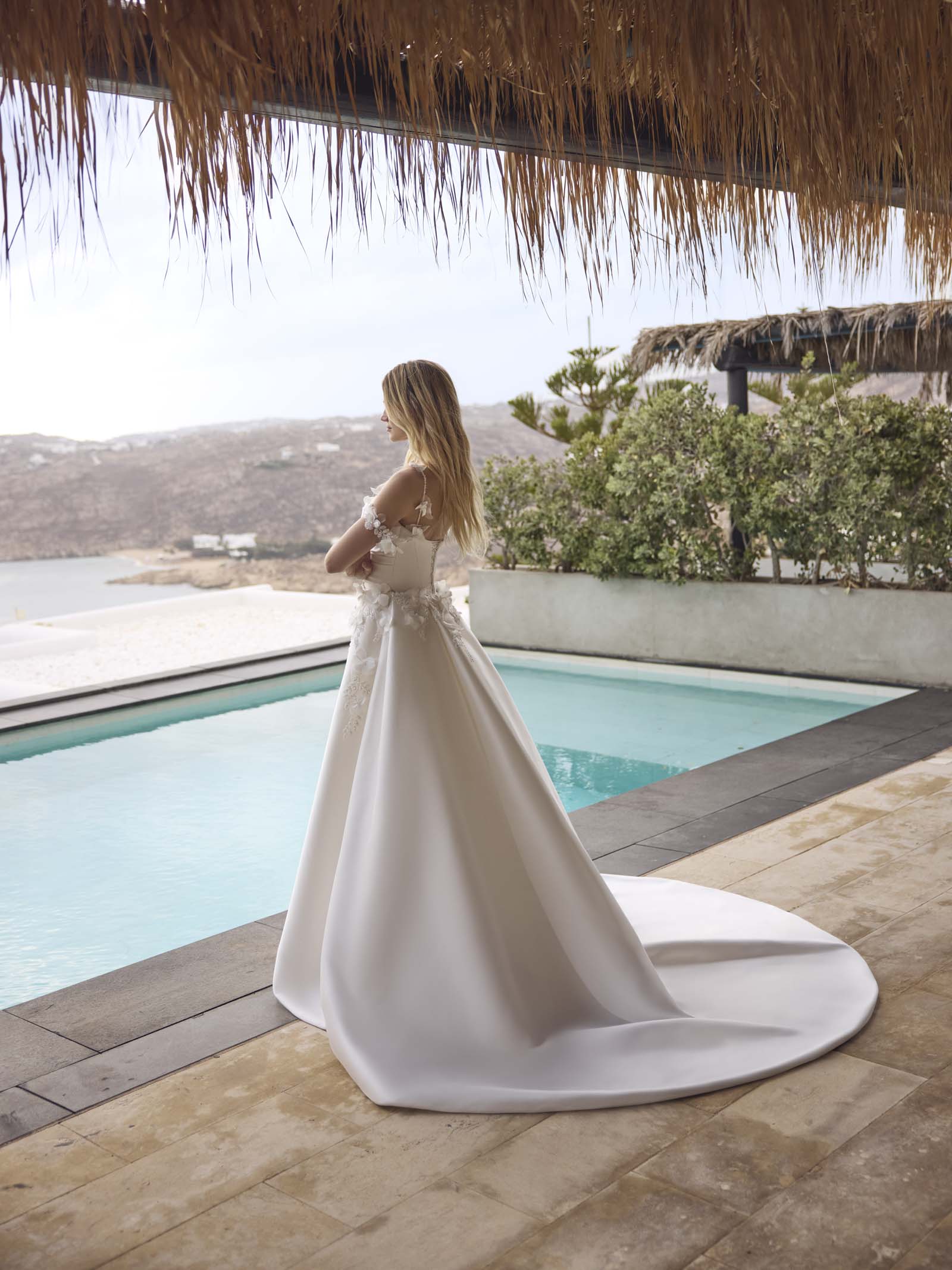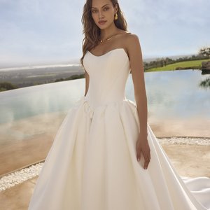 Der edle Mikado sorgt für einen cleanen, luxuriösen Fall und bringt den modernen Minimal-Vibe perfekt zur Geltung. Zarte Spaghettiträger und feminine Drapierungen runden den Look ab. Dieses figurbetonte Brautkleid ist ideal, wenn Du Dir eine Kombination aus zeitloser Eleganz, moderner Raffinesse und praktischer Wandelbarkeit wünschst.