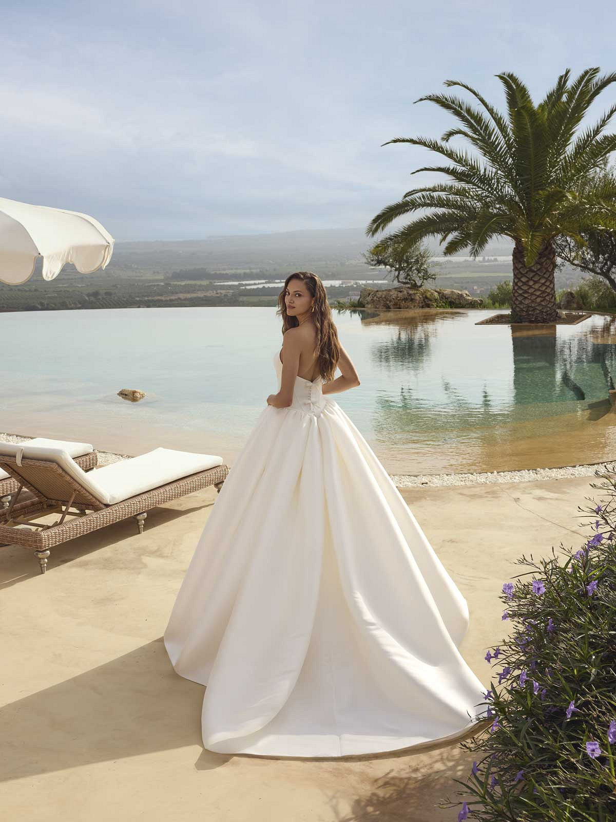 Ein besonderer Blickfang in diesem Hochzeitskleid ist die Basken-Taille, die Deine Figur optimal betont und nahtlos in den weiten, voluminösen Rock übergeht. Hinten überrascht das Kleid mit zwei stilvollen, dekorativen Schleifen, die dem minimalistischen Design eine verspielte Note verleiht. Die lange Schleppe sorgt für einen royalen Auftritt und macht dieses Prinzessinnen-Brautkleid zum perfekten Begleiter für Deine große Bühne.