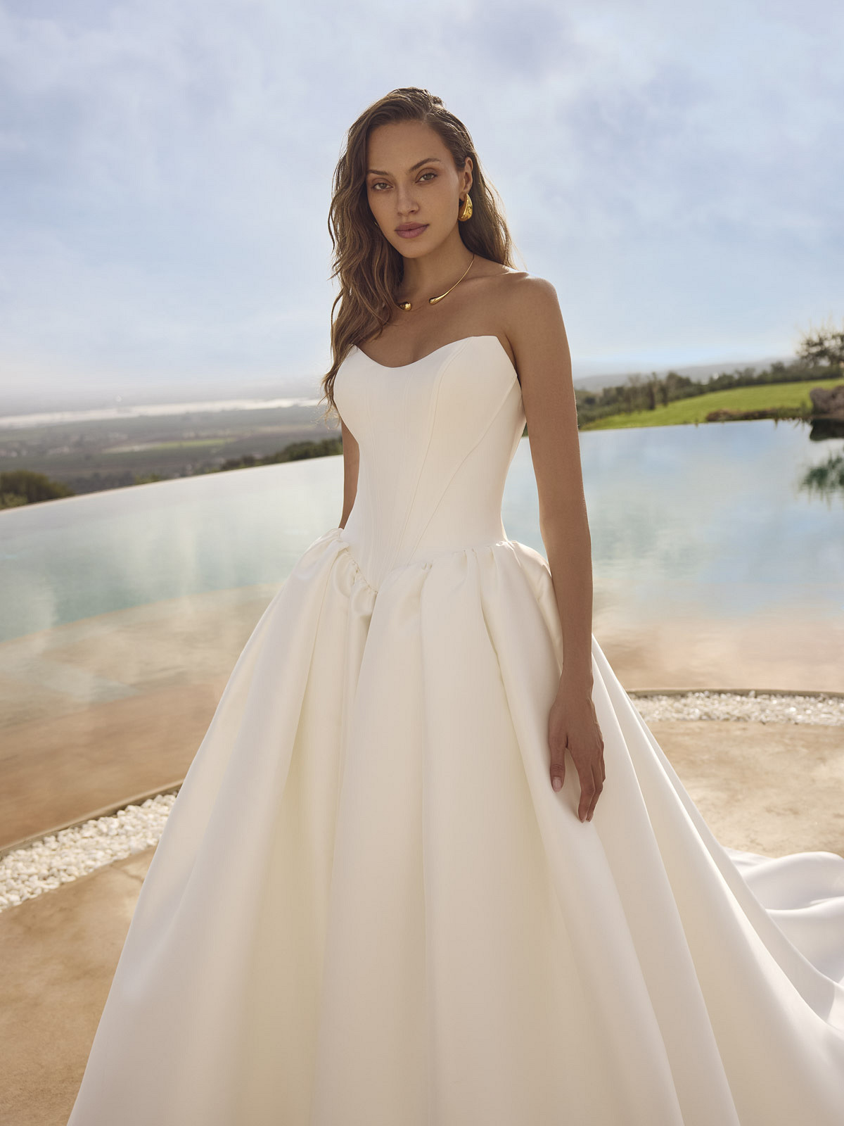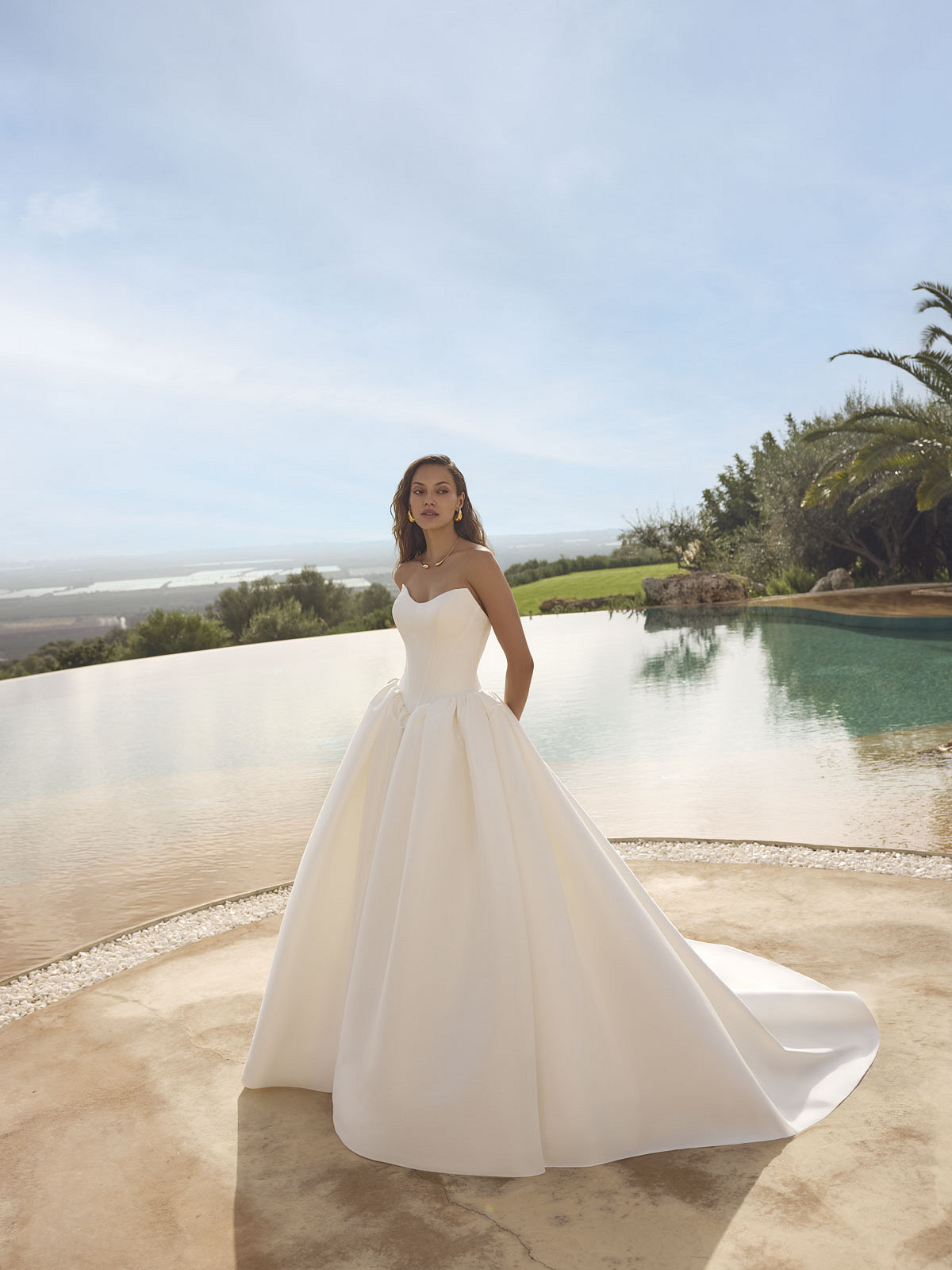 Minimalistisch, majestätisch und absolut zeitlos – dieses cleane Prinzessinnen Brautkleid vereint klassischen Glamour mit modernem Understatement. Der edle Stoff aus Mikado verleiht dem Brautkleid eine luxuriöse Struktur und einen eleganten Glanz, der schon beim ersten Schritt für einen Wow-Moment sorgt. Der herzförmig angedeutete Cat Eye-Ausschnitt geht in eine schlichte, trägerlose Form über und bringt Dein Dekolleté wunderschön zur Geltung.