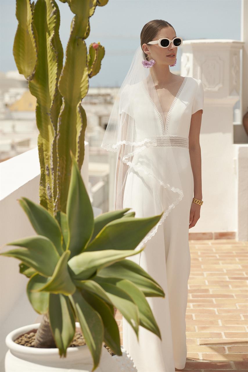 Besonders hervorzuheben sind die fein gesetzten Spitzendetails, die dem Jumpsuit einen Hauch von Romantik verleihen, ohne die klare, moderne Linie zu unterbrechen. Diese zarten Akzente fügen sich harmonisch in das Gesamtkonzept ein und machen den Jumpsuit zu einer hervorragenden Wahl für Bräute, die sich einen Look wünschen, der sowohl unkonventionell als auch elegant ist.