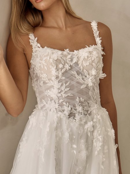 Dieses A-Linien Brautkleid begeistert mit einer traumhaft femininen Ausstrahlung und liebevoll ausgearbeiteten Details. Das Oberteil ist mit aufwendiger 3D-floraler Spitze verziert, die dem Kleid eine besondere Tiefe und Lebendigkeit verleiht. In den Blüten sind fein schimmernde Perlen eingearbeitet, die bei jeder Bewegung sanft das Licht einfangen und dem Look einen edlen Glanz verleihen.