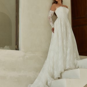 Die Corsage ist leicht transparent und kunstvoll gerafft, wodurch sie die Silhouette wunderschön formt und gleichzeitig modern und zart wirkt. Die florale Spitze fließt harmonisch vom Oberteil in den Rock über und schafft einen weichen, fließenden Übergang, der das Design besonders hochwertig erscheinen lässt.