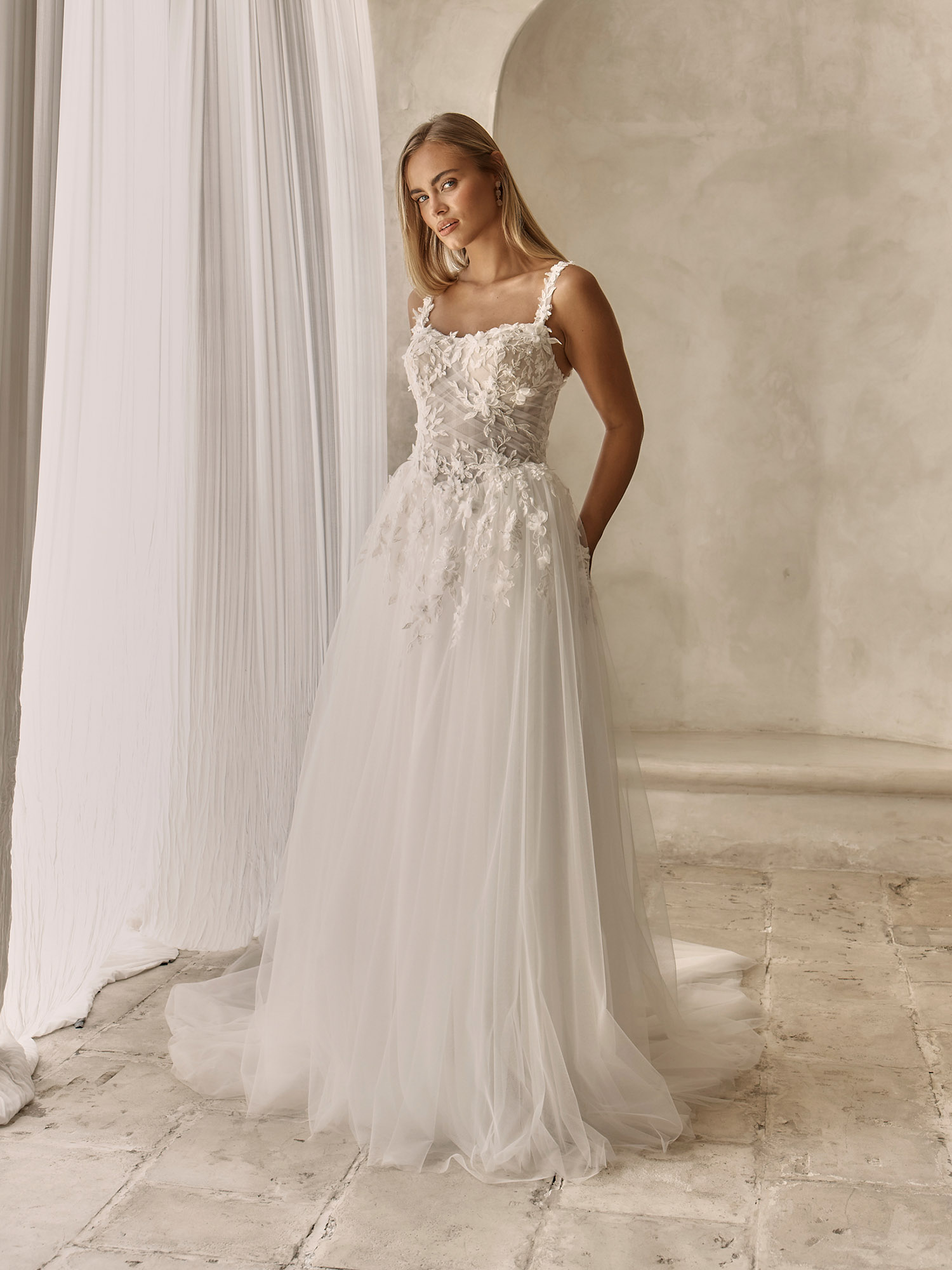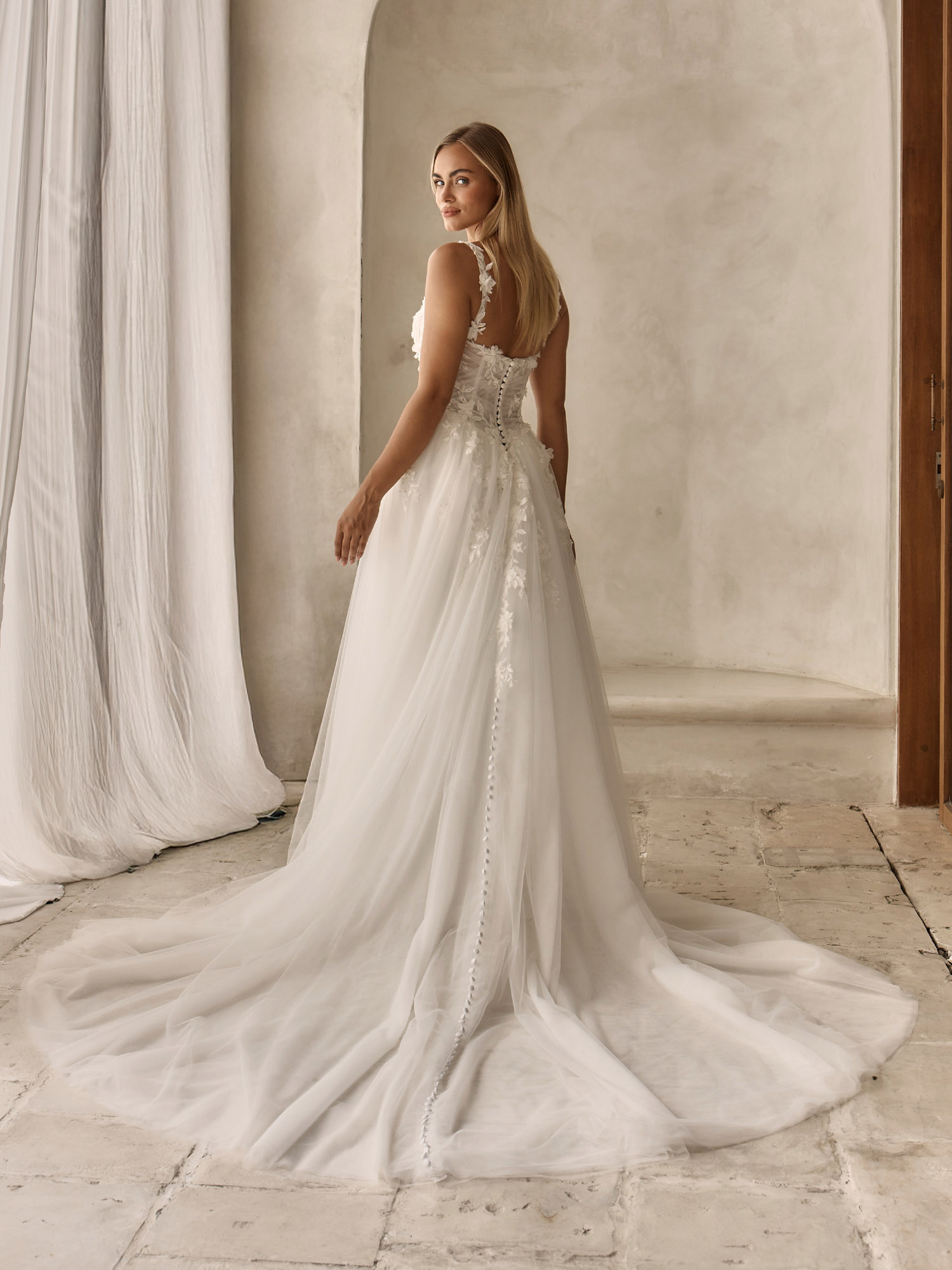 Der soft fallende Tüllrock unterstreicht die Leichtigkeit des Kleides und sorgt für eine romantische, schwebende Bewegung. Die klassische A-Linie schmeichelt der Figur und verleiht dem Brautkleid eine zeitlose Eleganz – perfekt für Bräute, die sich einen femininen, stilvollen und zugleich modernen Look wünschen.