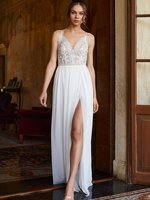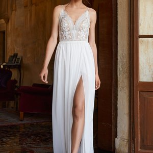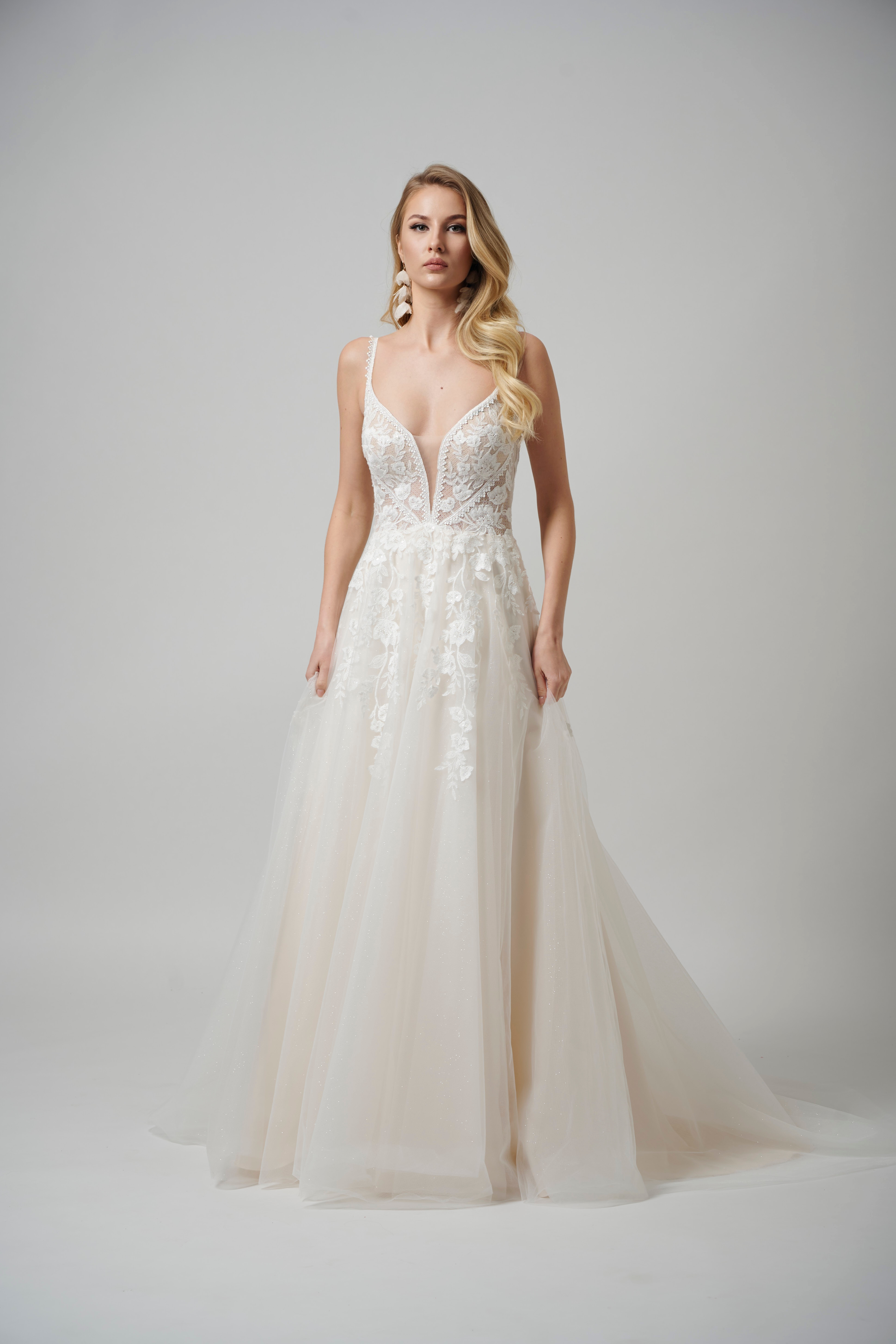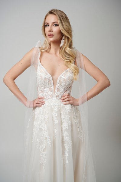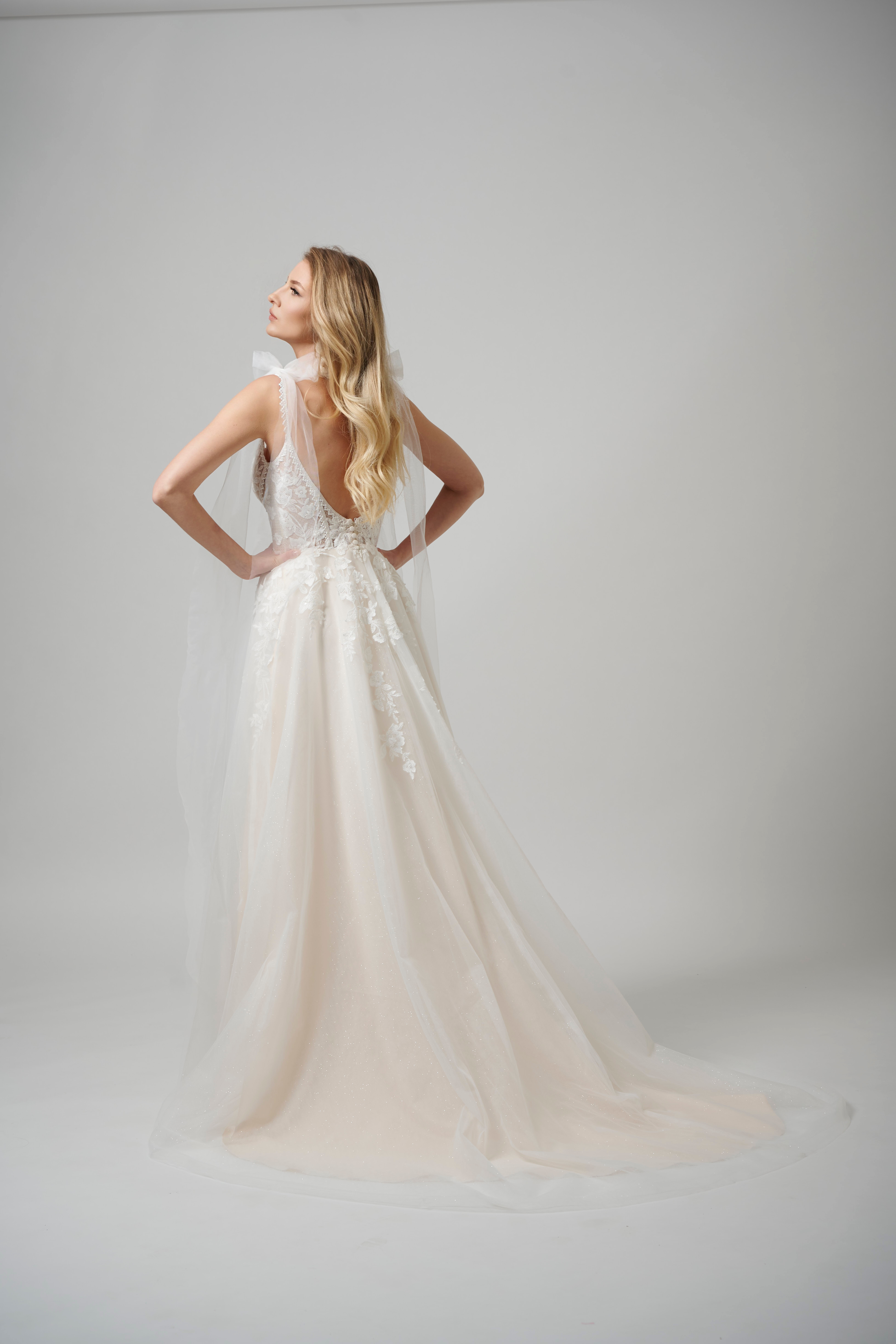 Der tiefe Rückenausschnitt wird von zarten Knöpfchen und zusätzlicher Spitze geschmückt, um dem Kleid den perfekten Abschluss zu verleihen. Dieses Brautkleid verkörpert die zauberhafte Romantik vergangener Zeiten und wird deinen Hochzeitstag mit zeitloser Eleganz erfüllen.