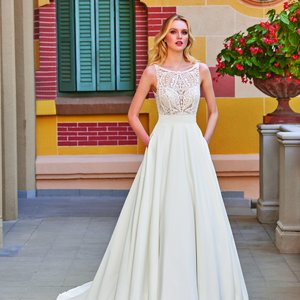 Dieses elegante A-Linien-Brautkleid vereint die klassische Schönheit von Spitze mit der zeitlosen Eleganz von Mikado. Das Oberteil des Kleides ist kunstvoll mit floralen Spitzenapplikationen verziert, die sich harmonisch über den tiefen V-Ausschnitt erstrecken und das Dekolleté elegant betonen. Die breiten Träger aus Spitze setzen die Schultern dezent in Szene und sorgen für eine romantische und zugleich moderne Ausstrahlung.